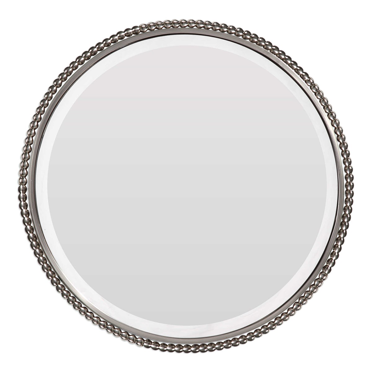 A beaded metal trim paired with a beveled mirror top make a classic accent, along with tapering arched legs and ball feet in a plated brushed nickel finish.