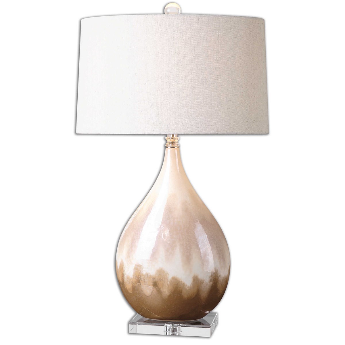 Ceramic base finished in a metallic rust beige glaze with ivory undertones and crystal accents. The slightly tapered oval hardback shade is a light beige linen fabric with natural slubbing. Due to the nature of fired glazes on ceramic lamps, finishes will vary slightly.
