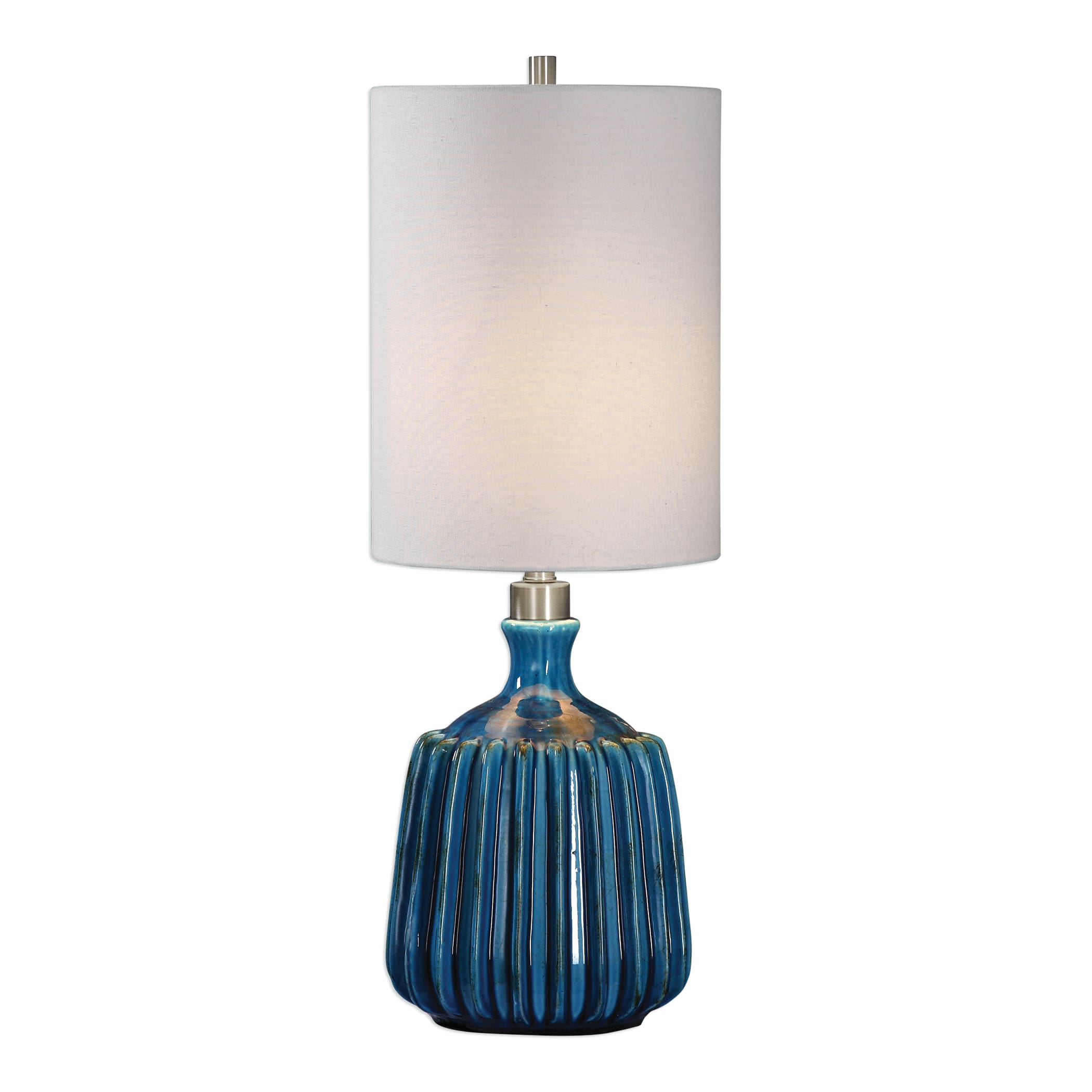 Aged, Dark Blue Ceramic, Featuring Deep Ridges And Rust Distressing, Accented With Brushed Nickel Plated Details. The Tall Round Hardback Shade Is An Off-white Linen Fabric With Light Slubbing. Due To The Nature Of Fired Glazes On Ceramic Lamps, Finishes Will Vary Slightly.