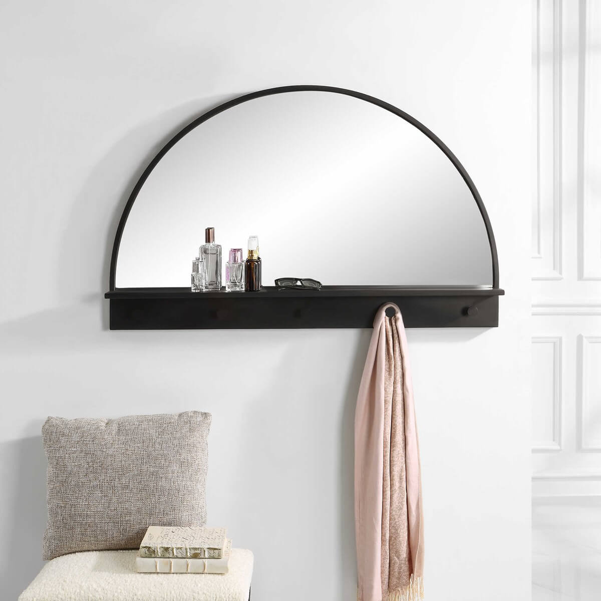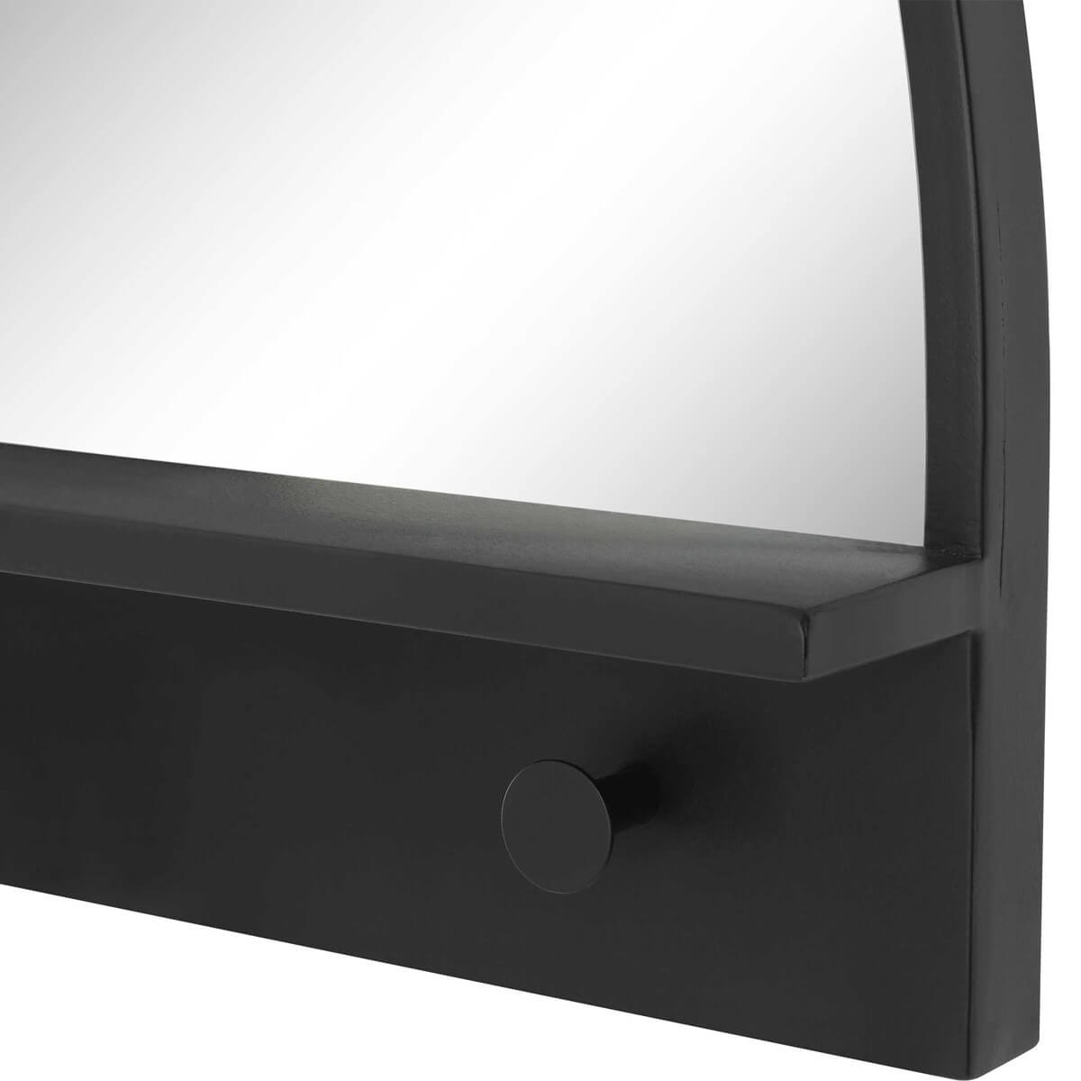 Arch mirror features a heavy curved iron frame finished in satin black with a slim iron shelf and round hooks for outerwear and other daily essentials.
