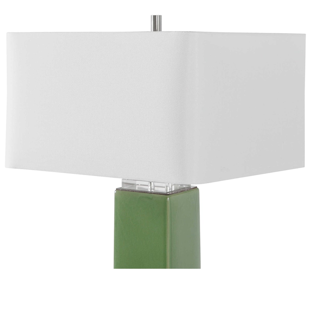 Finished In A Striking Tropical Green Glaze, This Ceramic Table Lamp Is Accented By Thick Crystal Ornaments And Brushed Nickel Accents. The Square Hardback Shade Is A White Linen Fabric.