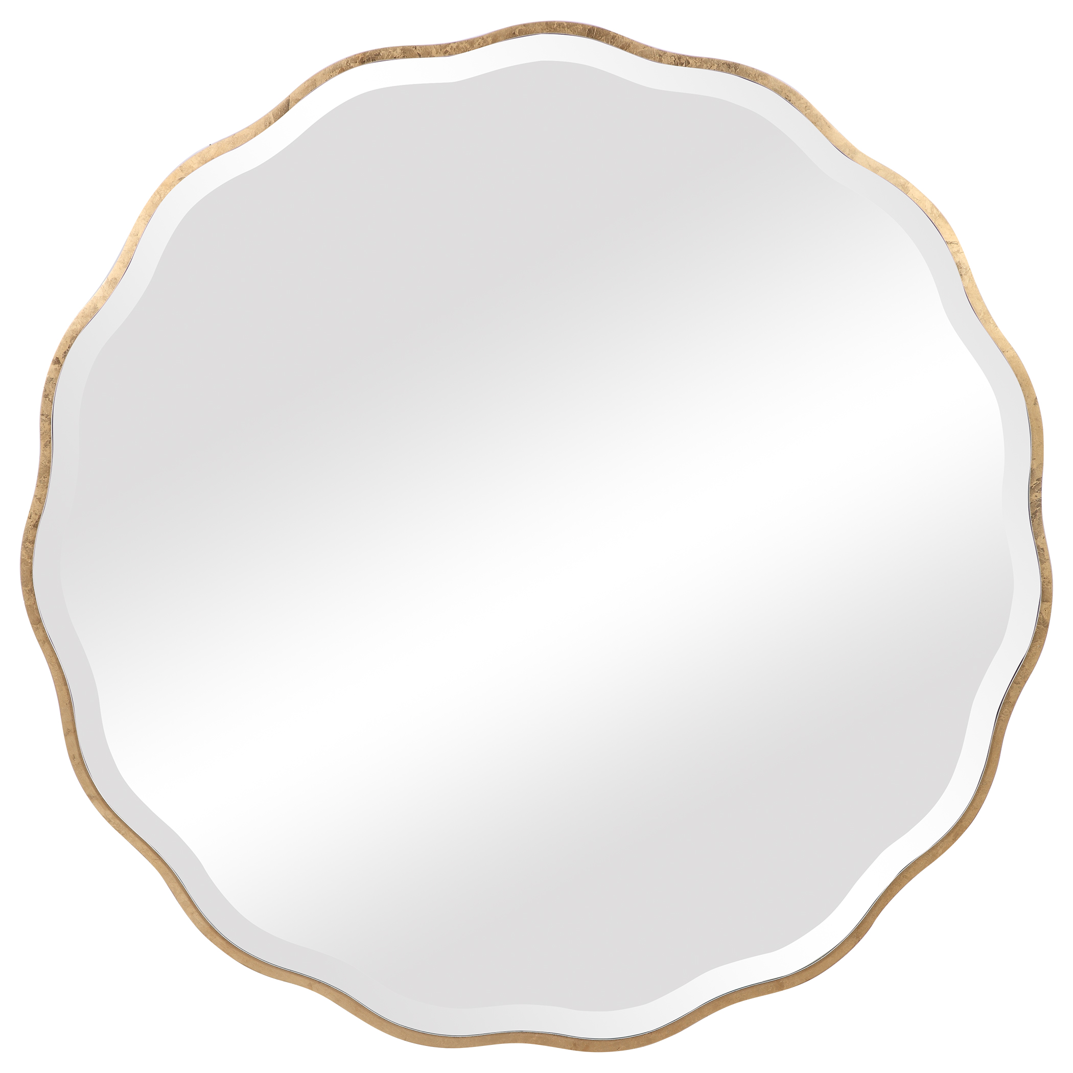 Showcasing A Feminine Scalloped Edge, This Shaped Wood Mirror Adds Whimsical Flair To Any Design. The Mirror Is Finished In Aged Gold And Has A 1 1/4" Bevel.