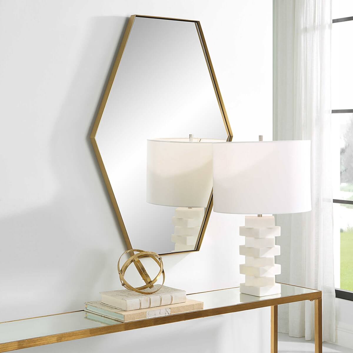 Hexagon mirror features a contemporary style using a stainless steel frame finished in a plated brushed brass.