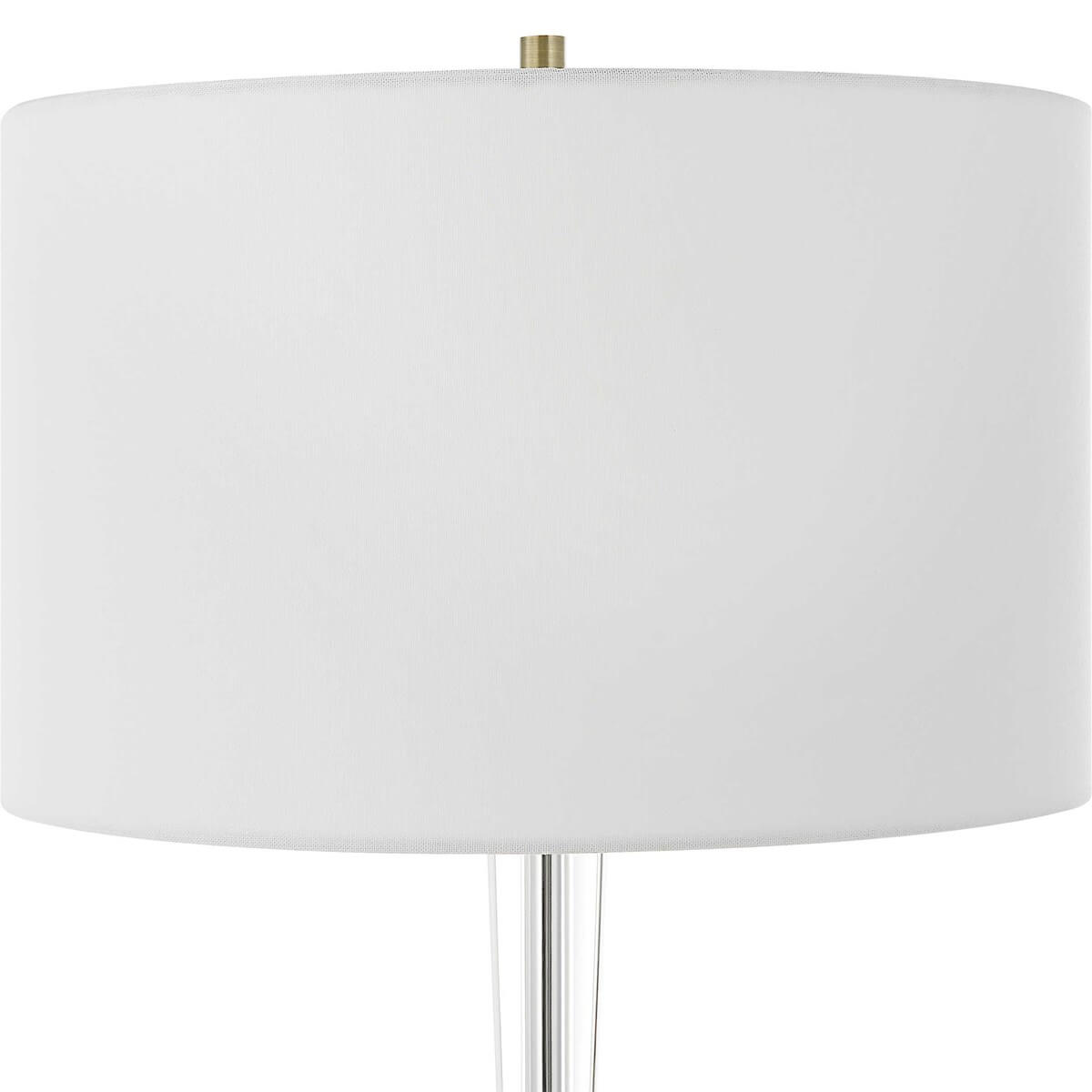 This elegant table lamp features a tapered crystal column, paired with thick crystal spheres, creating a timeless design that's accented with antiqued brass plated details for an updated appeal. The round drum shade is covered in a crisp white linen fabric.