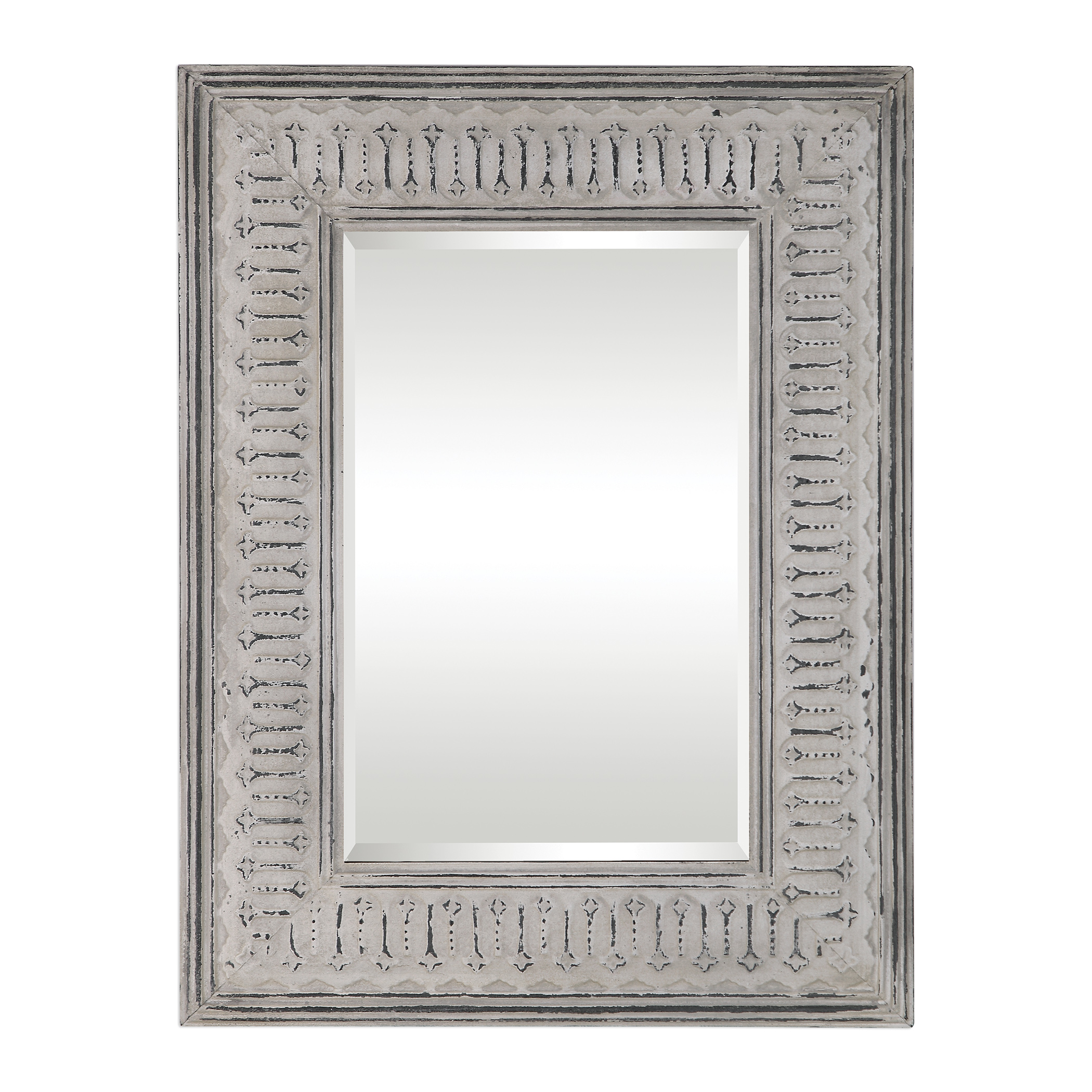 Hand Forged Iron Featuring An Embossed Decorative Design, Finished In A Distressed Taupe-ivory Wash, With Aged Gray Undertones. Mirror Features A Generous 1 1/4" Bevel And May Be Hung Horizontal Or Vertical.