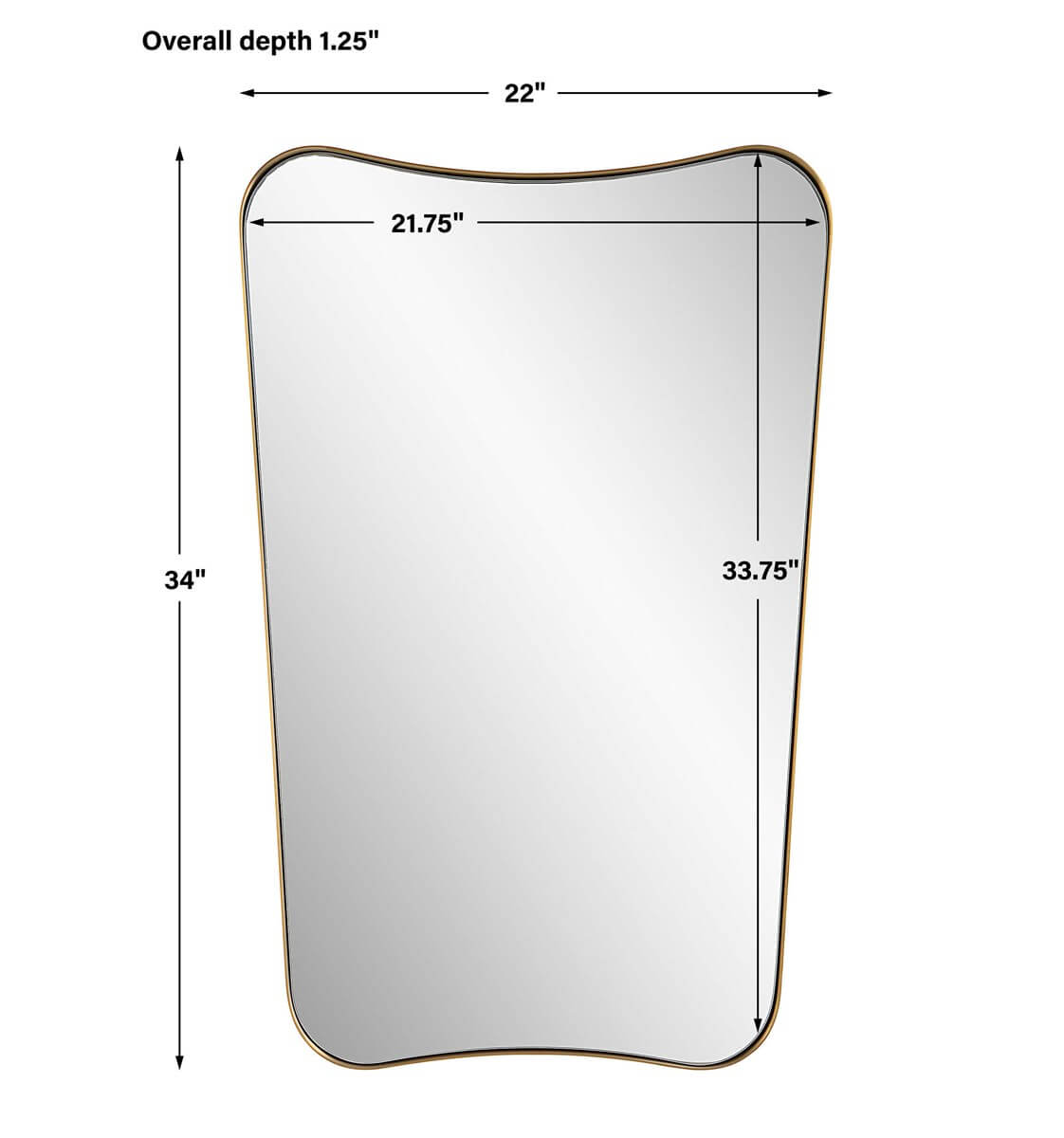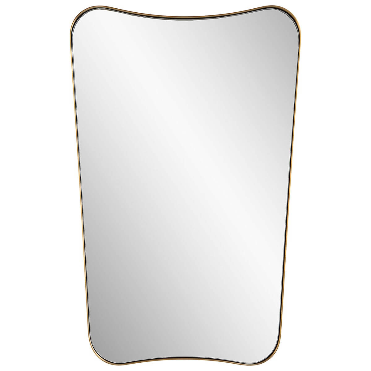 This vanity mirror features a sophisticated stainless steel frame finished in a rich antique brass. The curved silhouette adds a contemporary feel to this piece.
