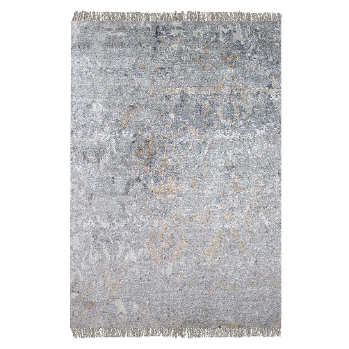 Hand Knotted Bamboo Viscose Mix In A Washed Gray, Featuring Abstract Detailing In Tones Of Subtle Beige And Lighter Grays, Accented With Knotted Fringe.
