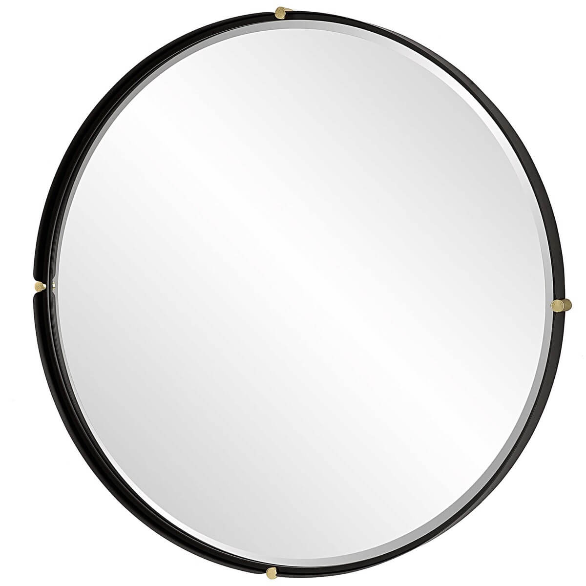 This large round mirror showcases a strap style iron frame finished in a sleek matte black with soft curved ends that encompass antique gold column medallions. The floating style mirror has a generous 1.25" bevel.