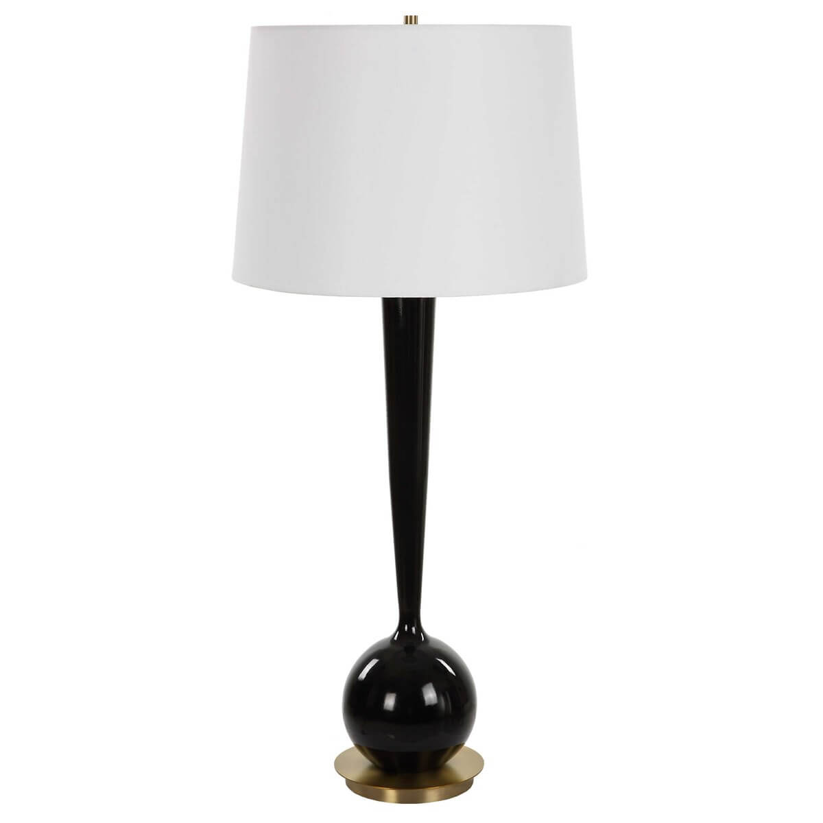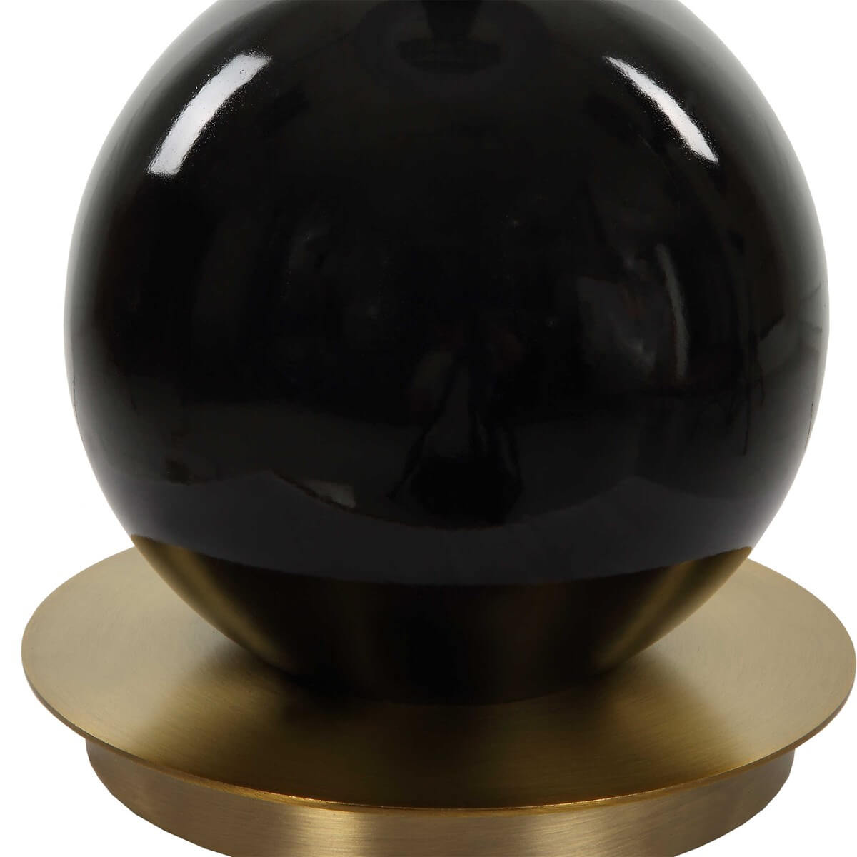 A nod to 1960's Mod design, the Brielle Table Lamp features a modern ceramic silhouette finished in a polished black glaze that's accented with plated brushed brass details. The slightly tapered round hardback shade is covered in a crisp white linen fabric.