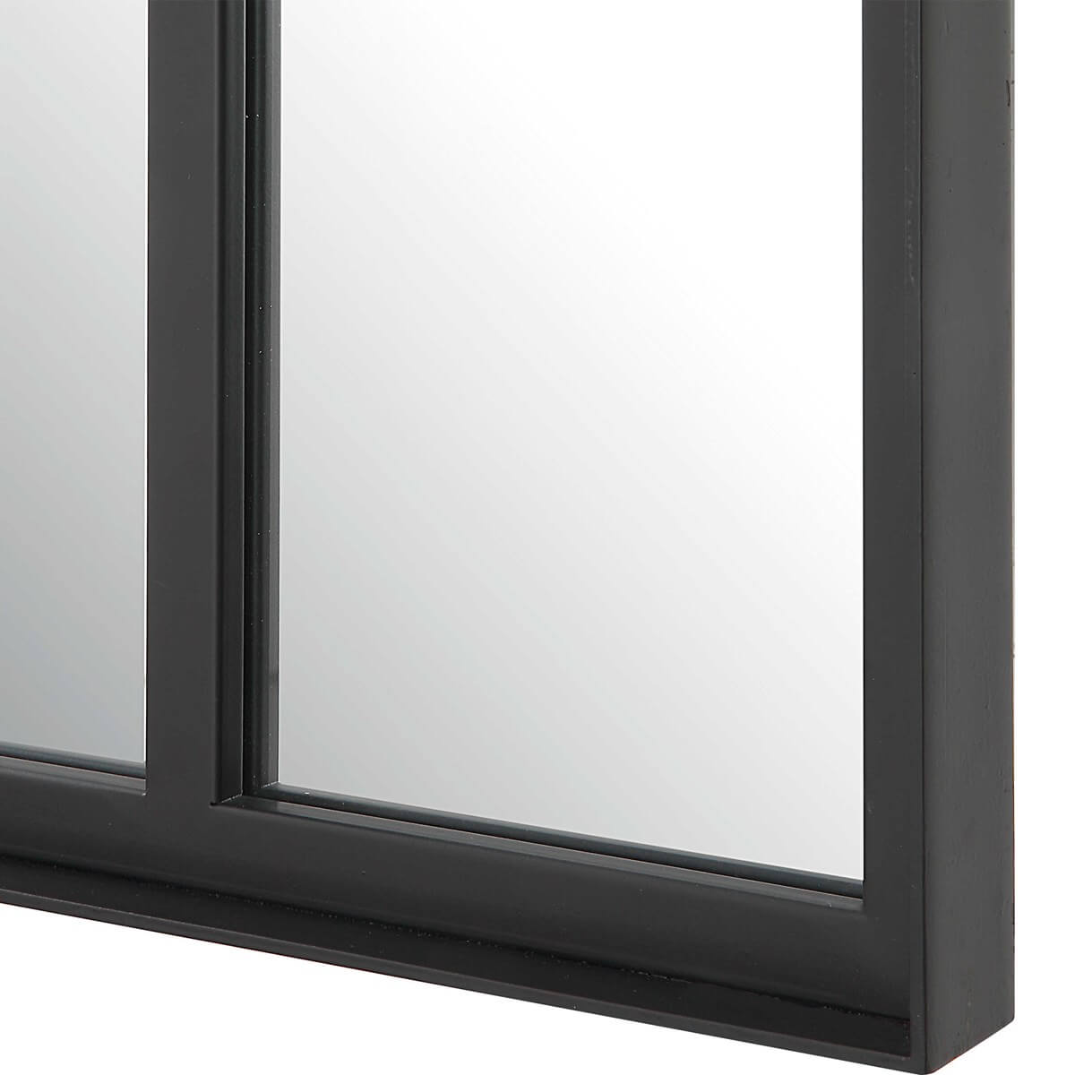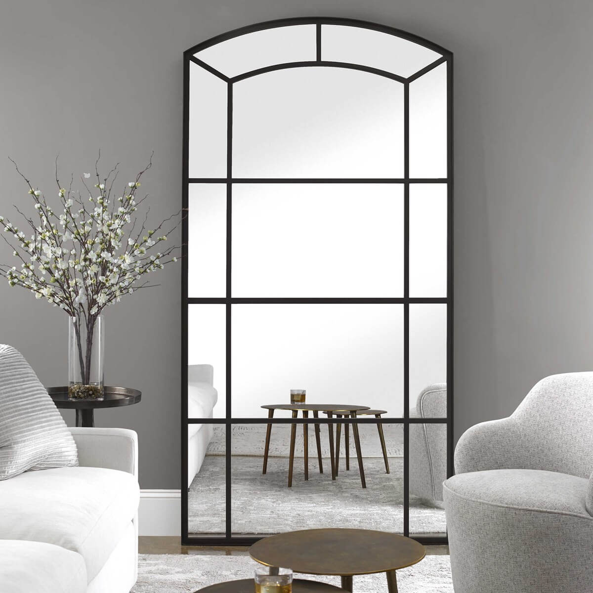 This oversized arch mirror features a substantial solid iron frame finished in a rich satin black, with a deep channeled outer edge.