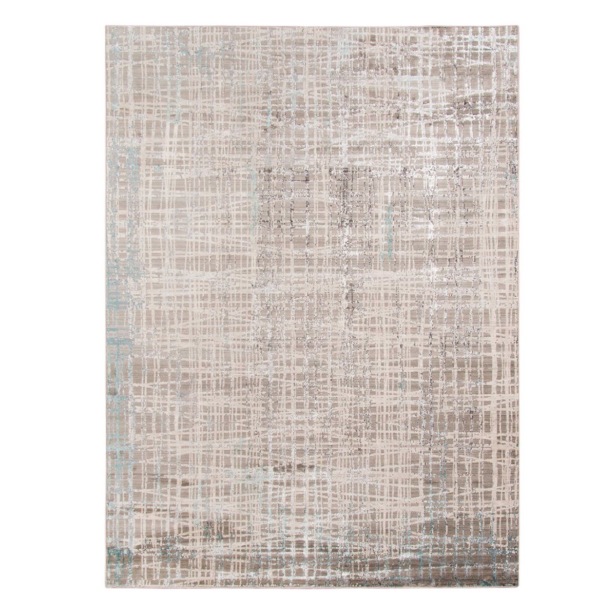 This Power Loomed Rug Features An Abstract Design In Tones Of Polyester Gray, And Beige, With Teal Blue Accents And Hints Of Charcoal.