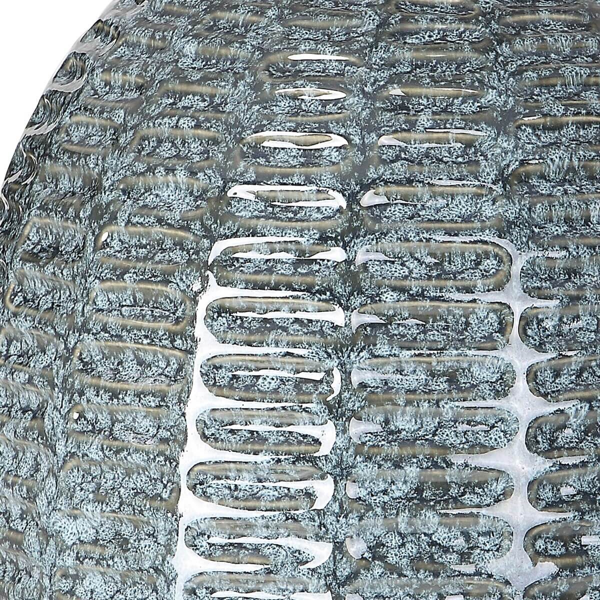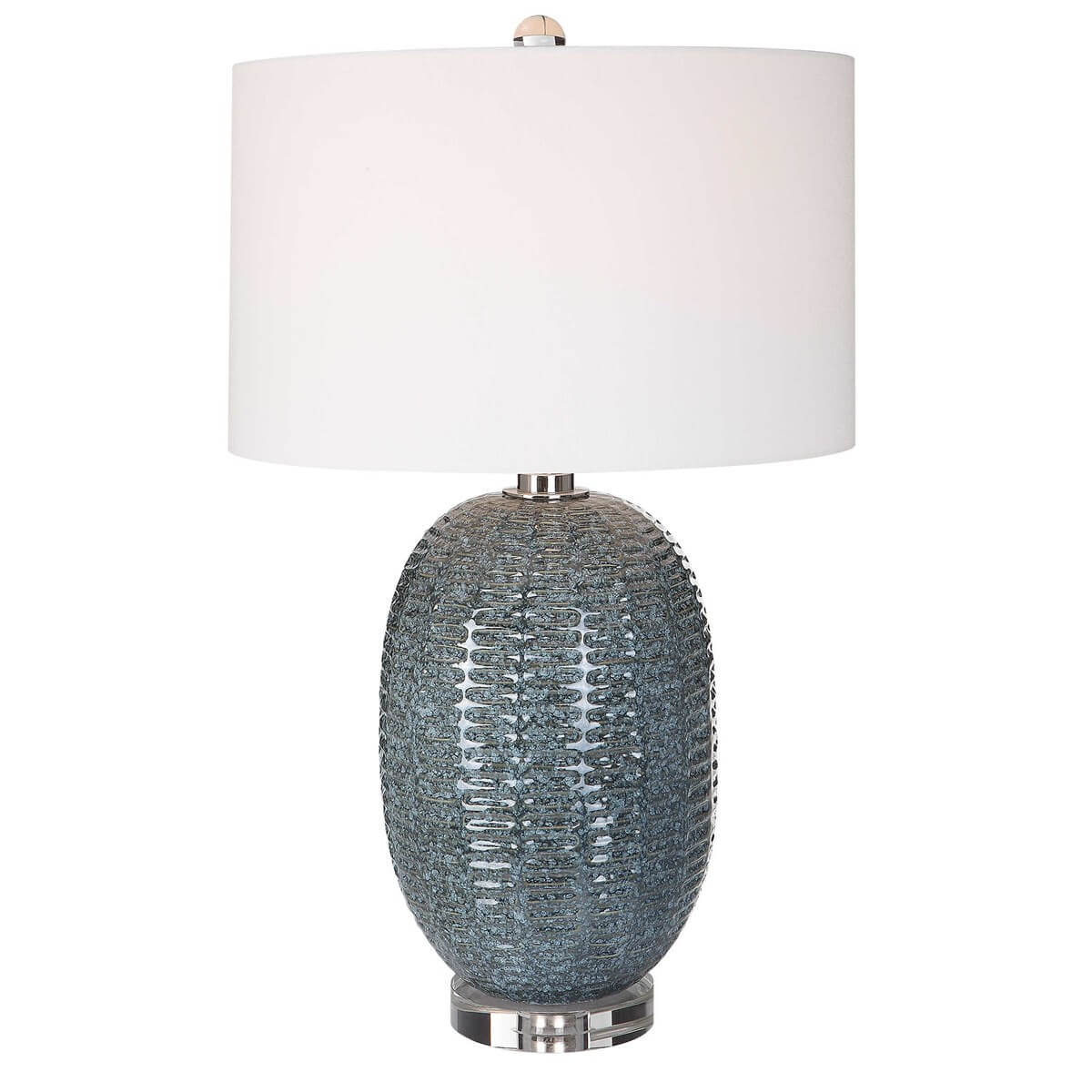 This ceramic table lamp features a repeating geometric motif finished in a mottled blue-green glaze, accented with polished nickel details and a thick crystal foot.