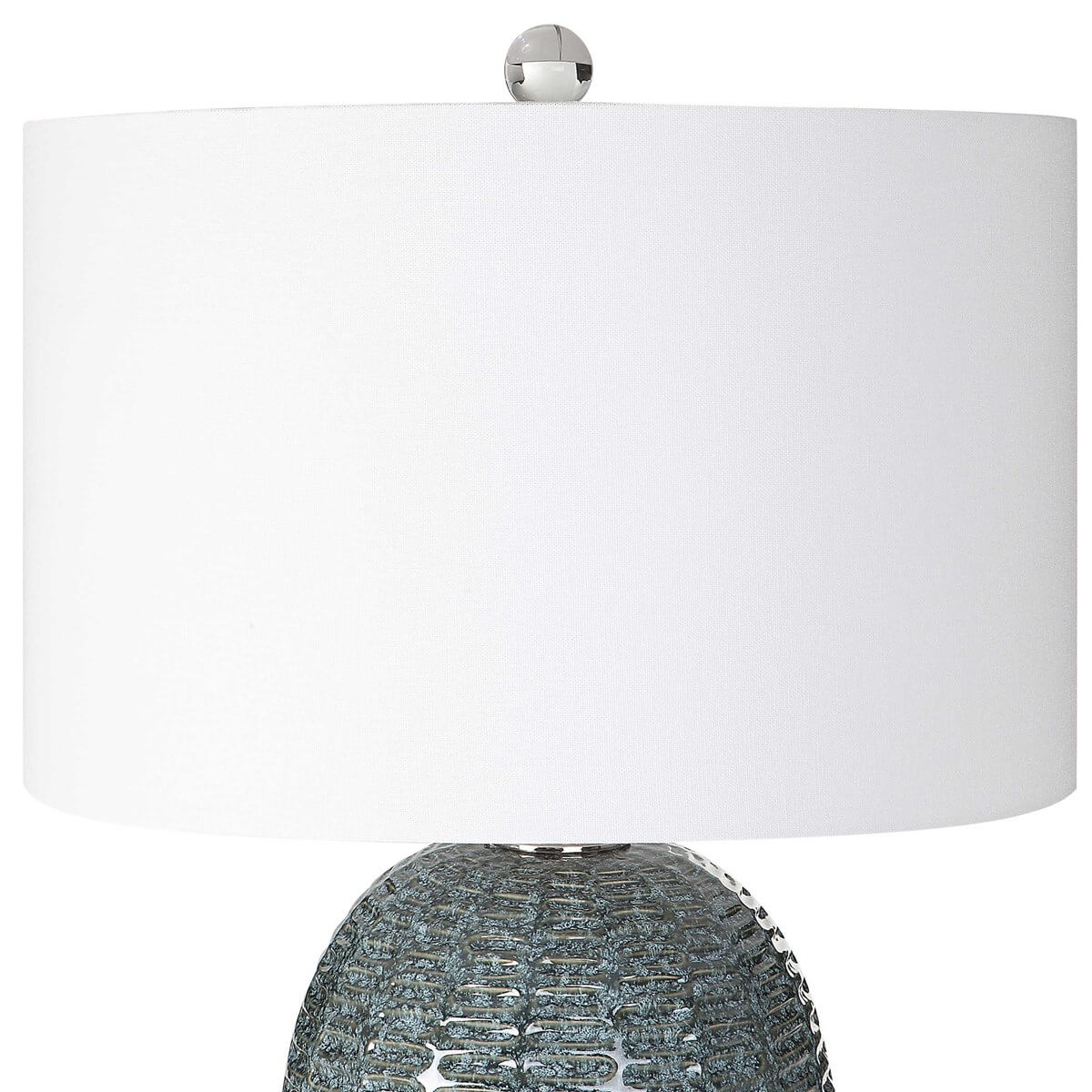 This ceramic table lamp features a repeating geometric motif finished in a mottled blue-green glaze, accented with polished nickel details and a thick crystal foot. The round hardback shade is a casual white linen fabric.