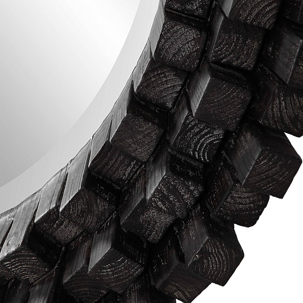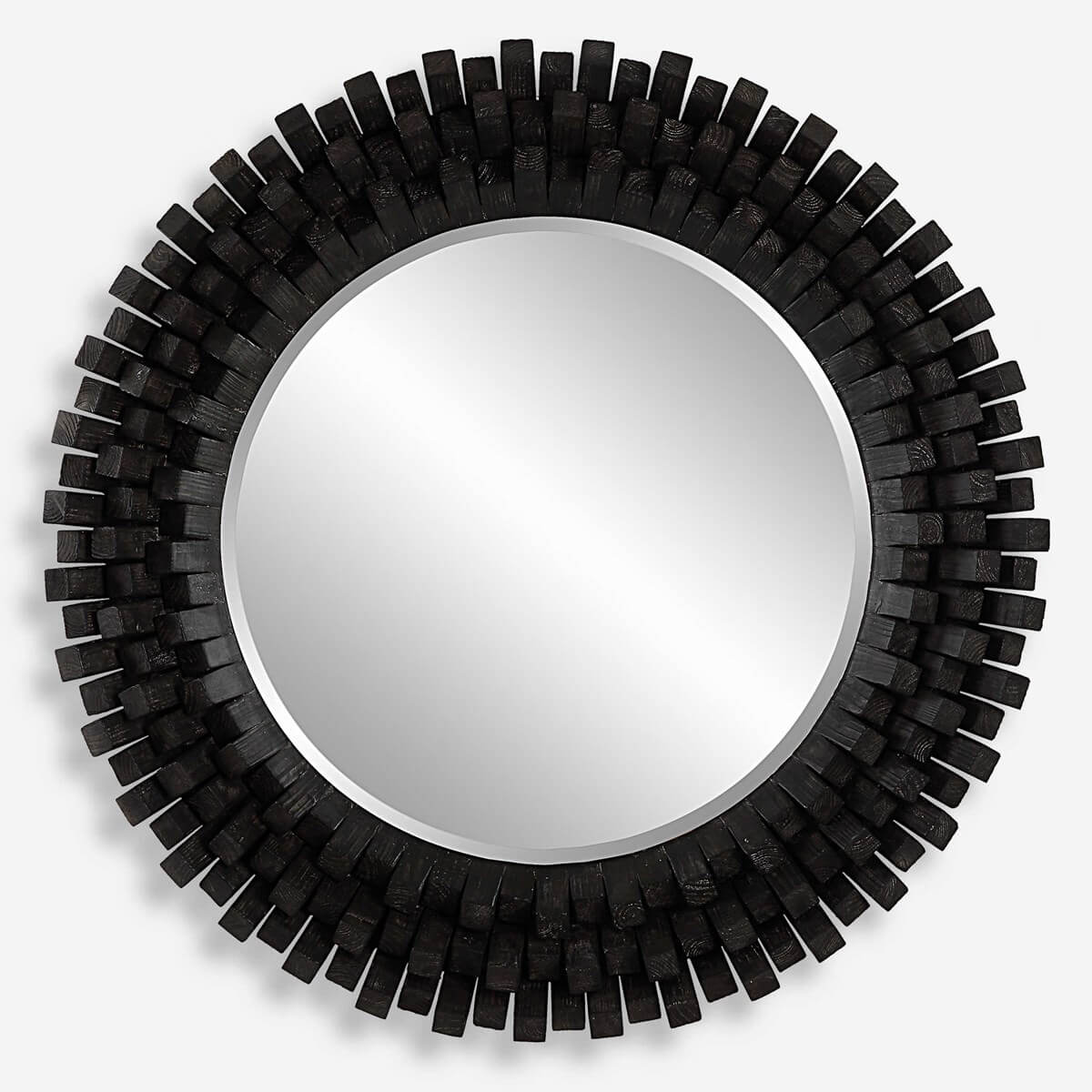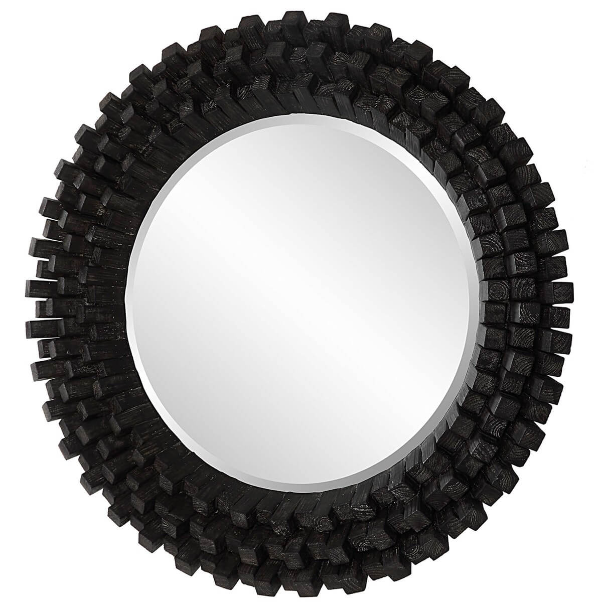 This round wood mirror has a contemporary rustic flair by featuring angled pillars of solid wood stacked in alternating heights for a dramatic and unique display, finished in an ebony stain with a subtle gray wash. Mirror has a generous 1 1/4" bevel.