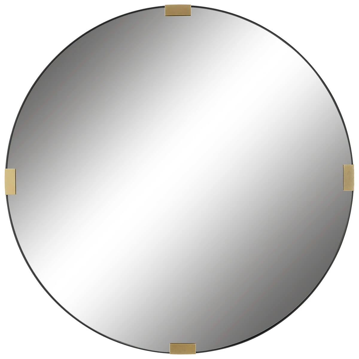 This round mirror's sleek design makes it the perfect modern accent. The iron band frame is finished in satin black and is accented by lightly antiqued gold leaf details.