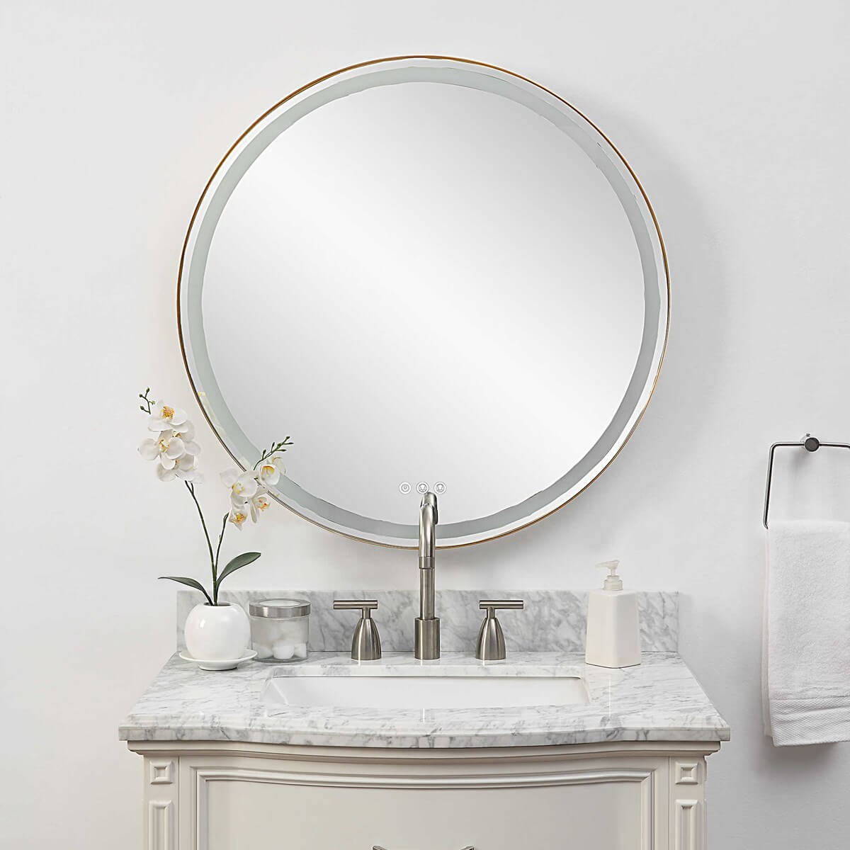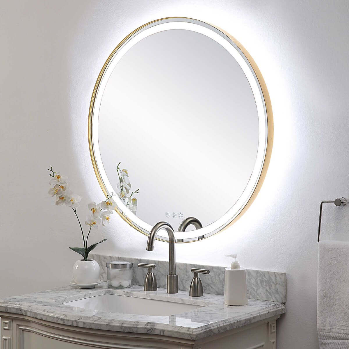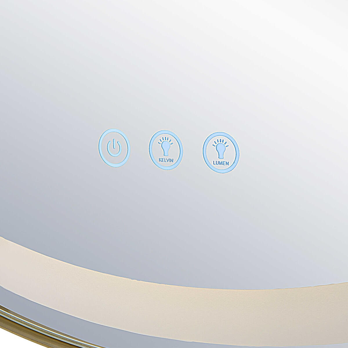 Versatile in design, this round mirror has integrated LED lighting that illuminates through the frosted strip in the polished edged mirror. The plated brushed brass stainless steel frame is off set from the wall to allow ambient lighting from the back. Easy to use touch buttons are featured on the bottom right of the mirror with an on off function, touch and hold kelvin control from 2700k to 4000k, and touch and hold brightness control. LED lights rated at 40,000 hours. Ships with plug, but can be hardwired professionally. Touch screen icons continue to illuminate when powered off for easy navigation in dark settings.