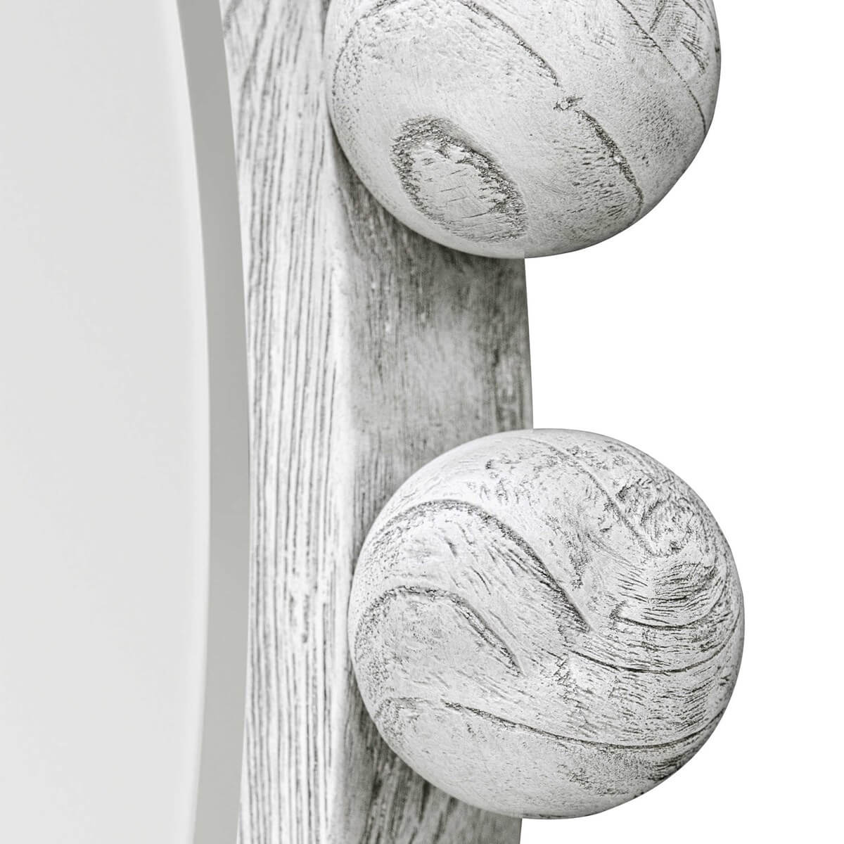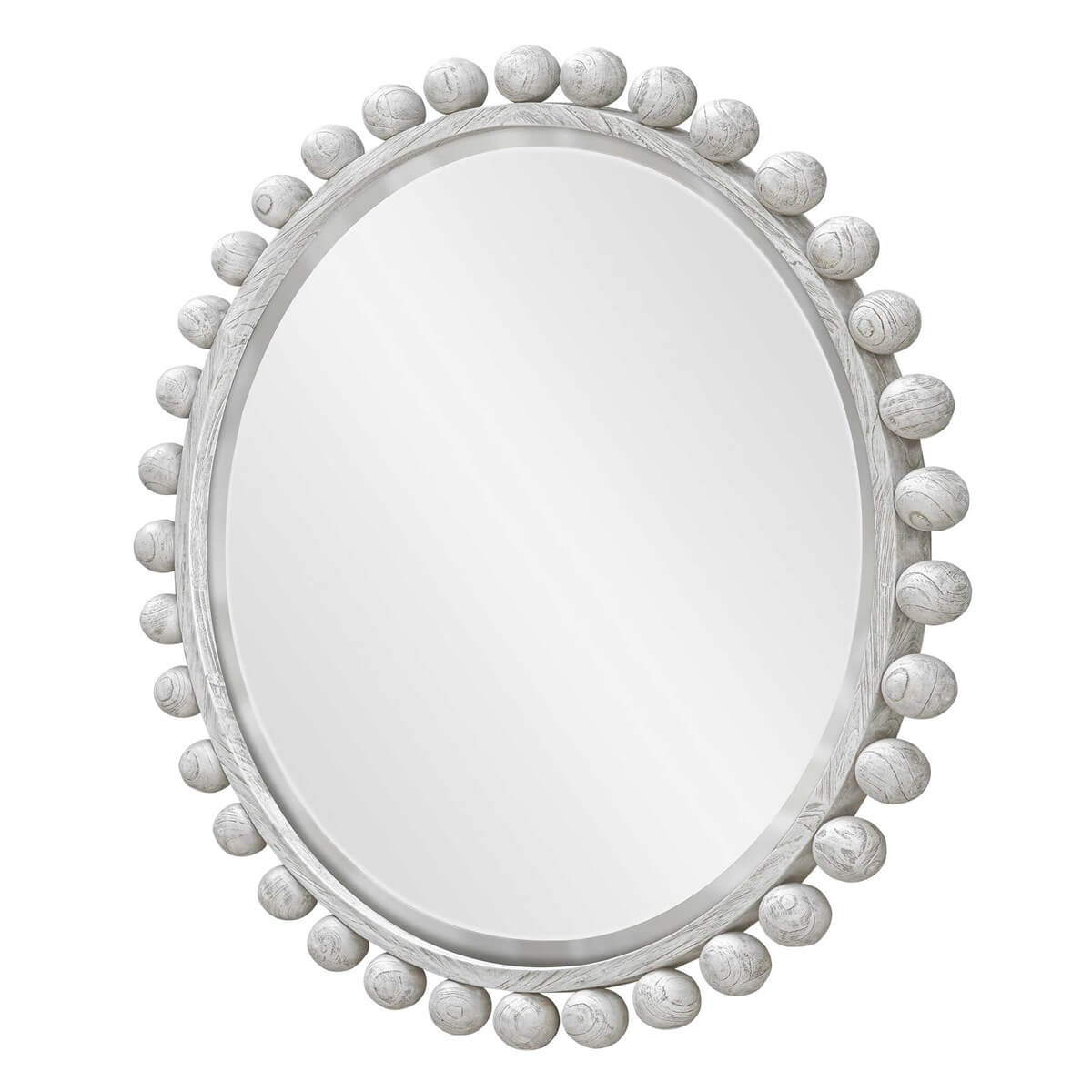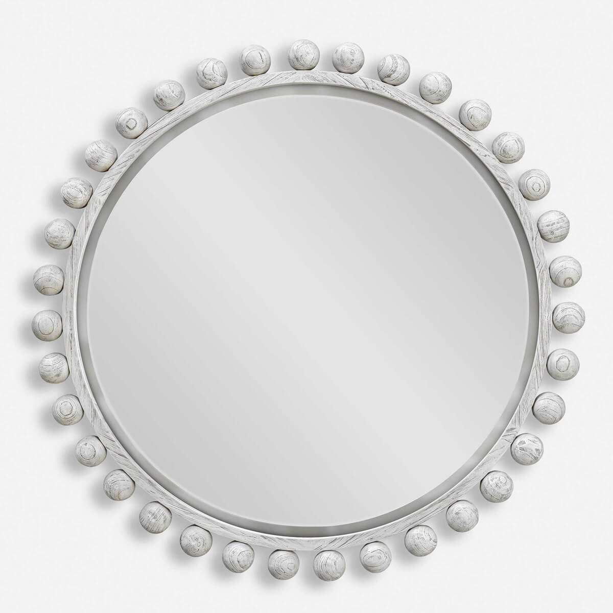 The Cyra Wood round mirror adds an upscale look and sophisticated style to any room by showcasing solid mahogany wood spheres that embellish a sleek inner frame, finished in a rustic aged ivory. Mirror has a generous 1 1/4" bevel.