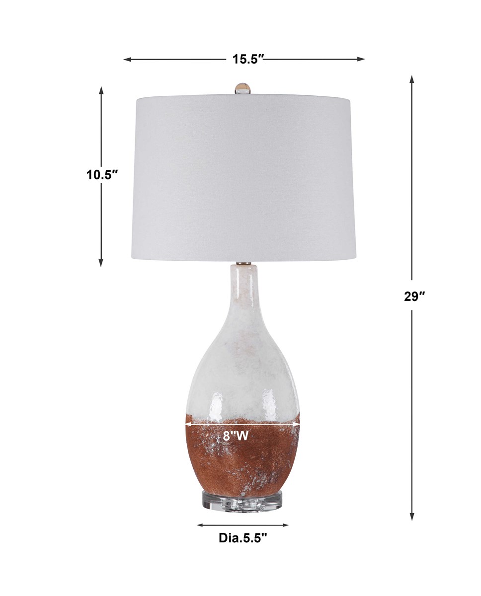This Table Lamp Features A Ceramic Base Finished In An Earthy Terracotta Rust That Transitions Into A Crackled Aged White Glaze, Accented With Brushed Nickel Plated Details And A Thick Crystal Foot. The Slightly Tapered Round Hardback Shade Is A White Linen Fabric.