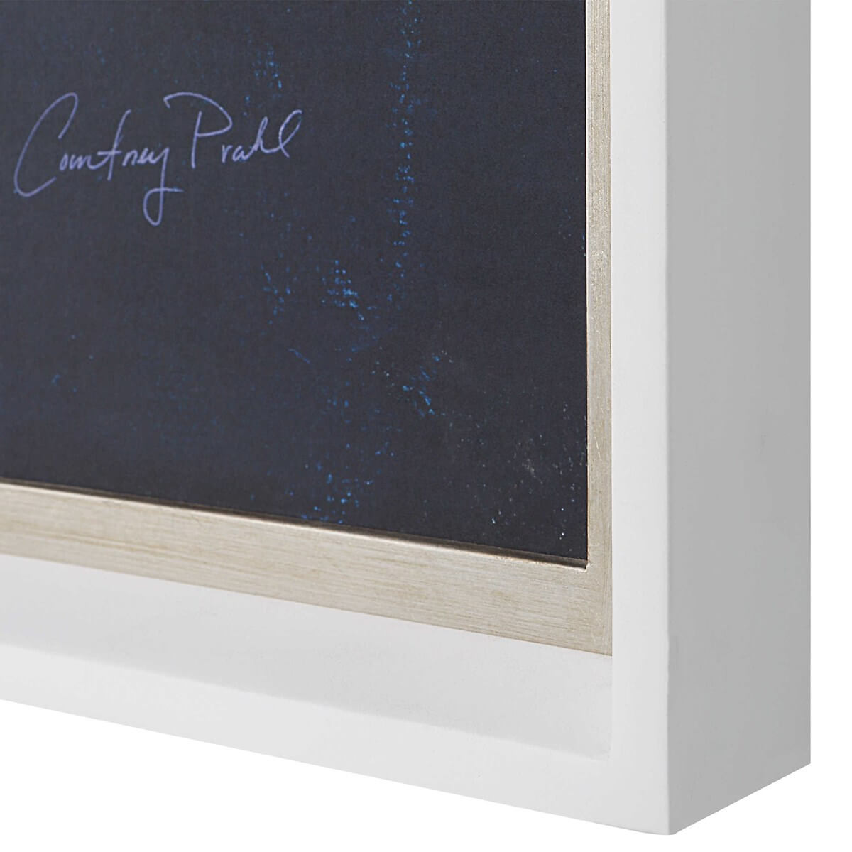 The Escape framed artwork depicts a compelling abstract design in deep cobalt blue and white. The print is accented by a contemporary white frame and silver leaf inner liner. Artwork by Courtney Prahl.