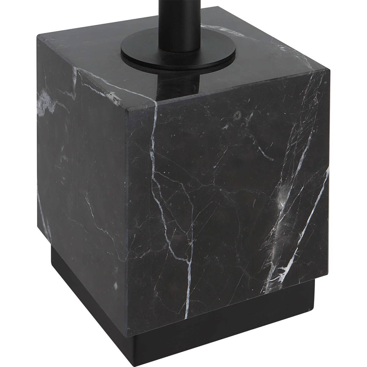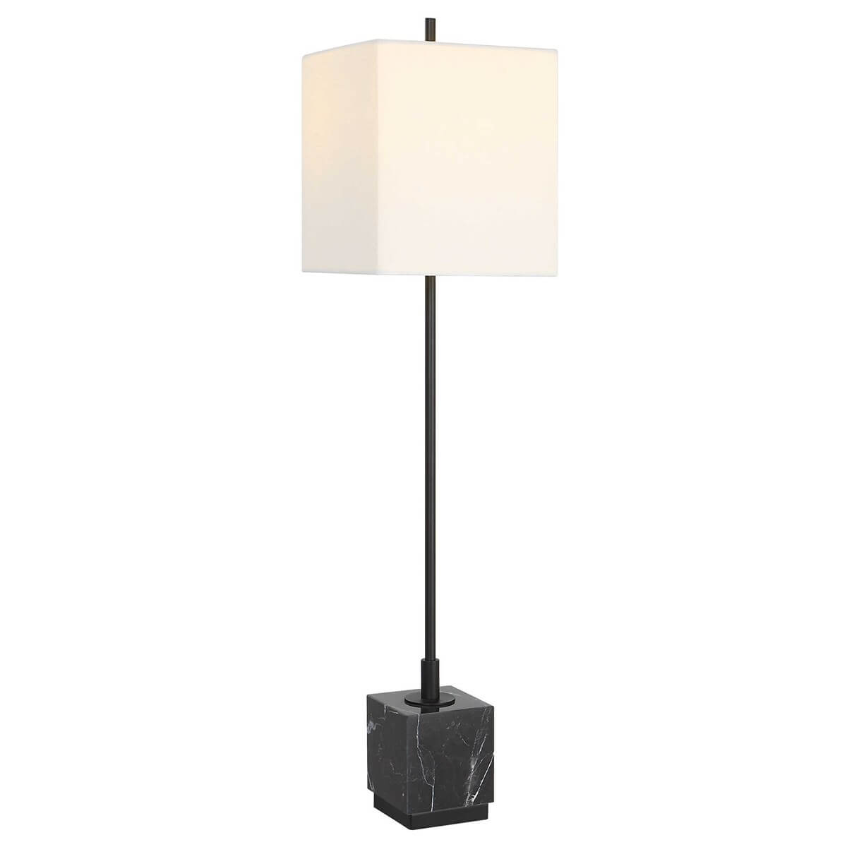 This versatile buffet lamp showcases a slim satin black metal base accented by a large black marble block foot with natural white veining.