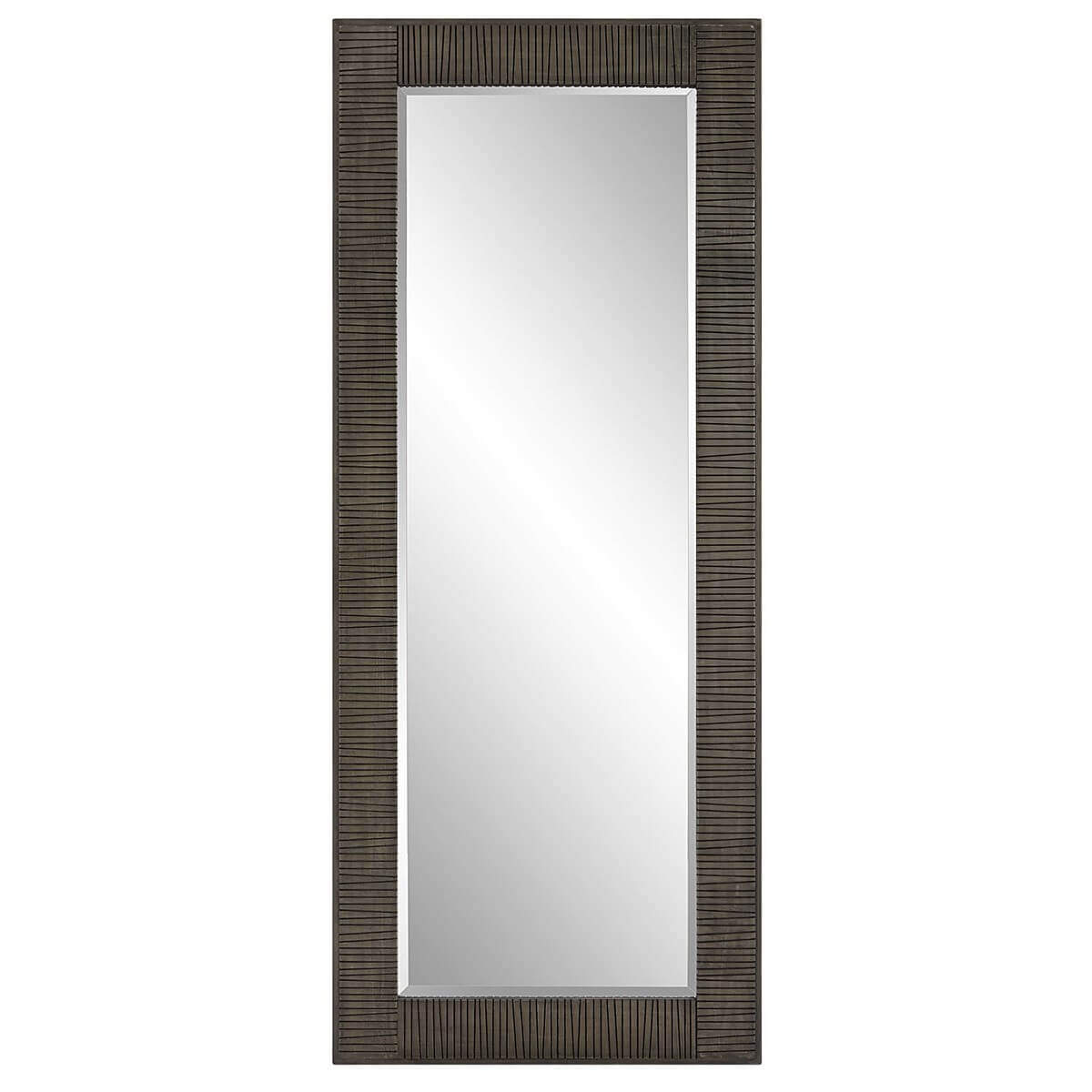 This oversized mirror features a solid wood frame with hand carved channels finished in a rustic wood tone with an aged gray wash. Mirror has a generous 1 1/4" bevel and may be hung horizontal or vertical.