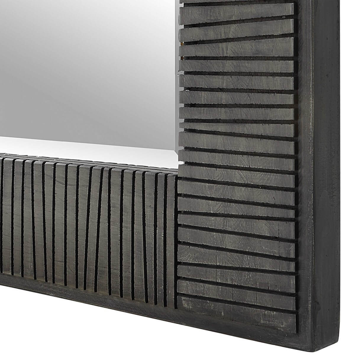 Oversized rectangle mirror features a solid wood frame with hand carved channels finished in a rustic wood tone with an aged gray wash.