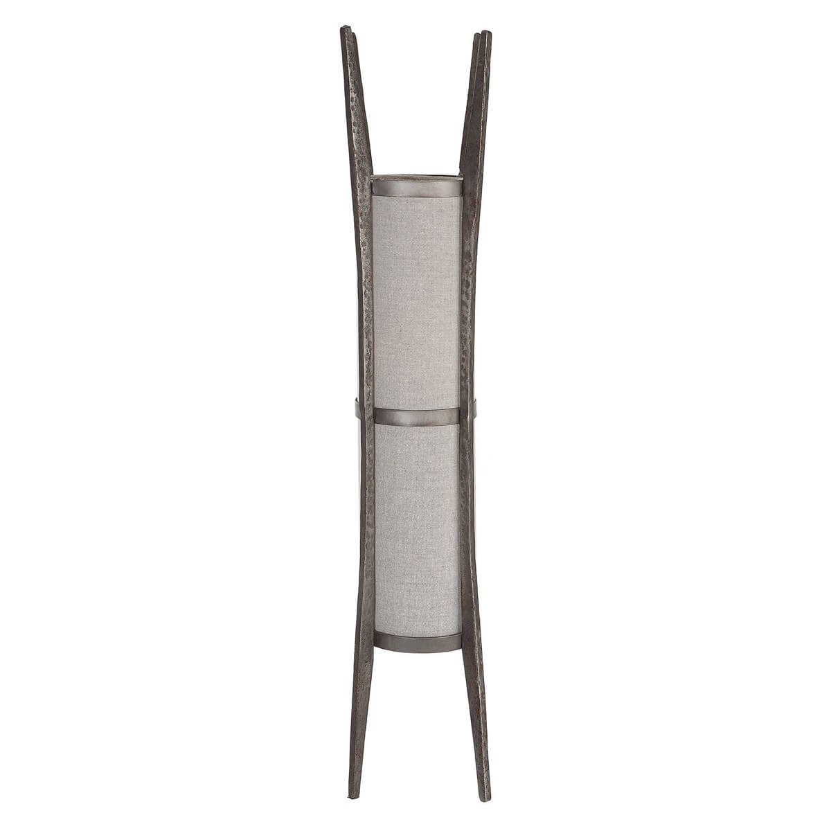 This rustic accent features a textured cast iron exterior framework finished in aged pewter with an oatmeal linen inner shade.