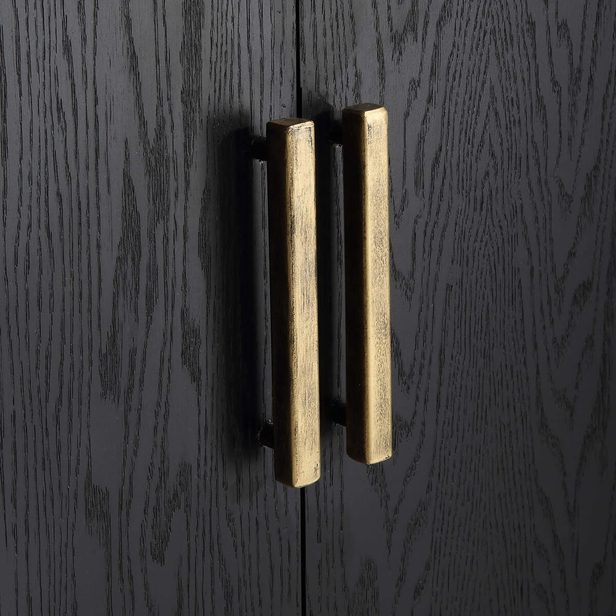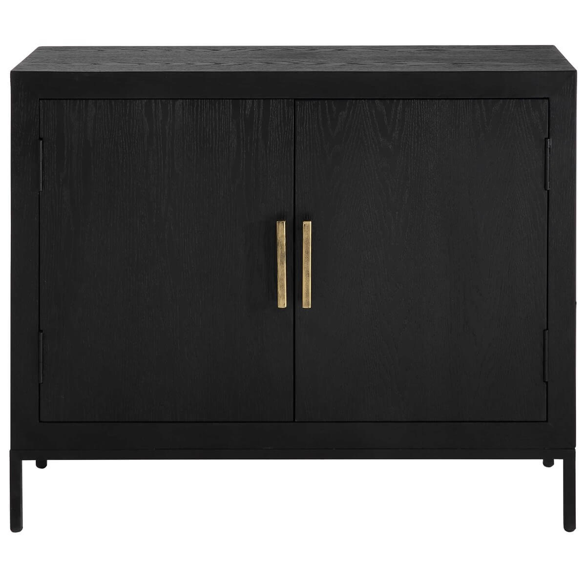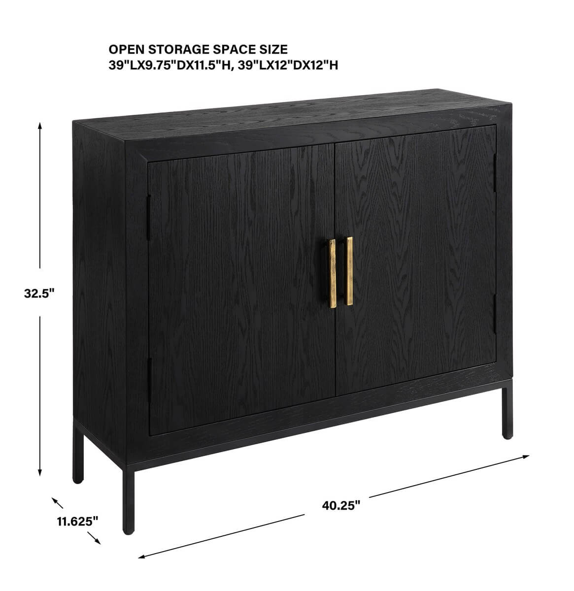 The Front Range Cabinet's streamlined design and classic finishes make it a perfect addition to virtually any space. The exterior is finished in a dark ebony oak veneer, accented by linear iron pulls in aged gold. Has one interior fixed shelf.