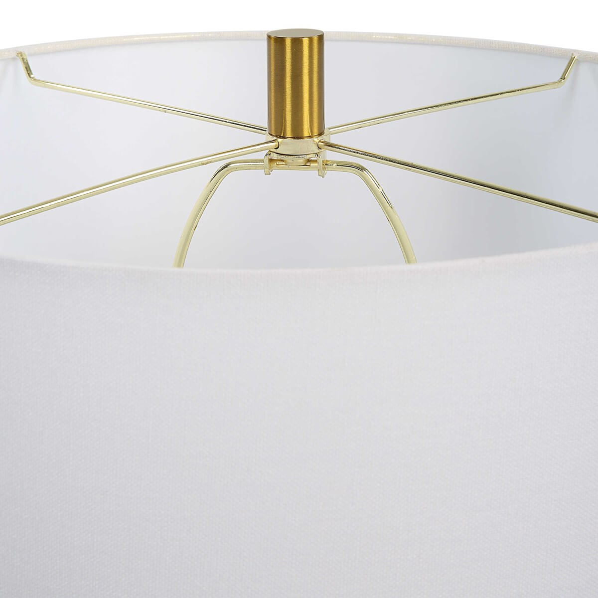 This timeless gourd shaped ceramic base is finished in a moss green glaze accented with lightly antiqued brass plated details. The round drum shade is made of white linen fabric. Due to the nature of fired glazes on ceramic lamps, finishes will vary slightly.