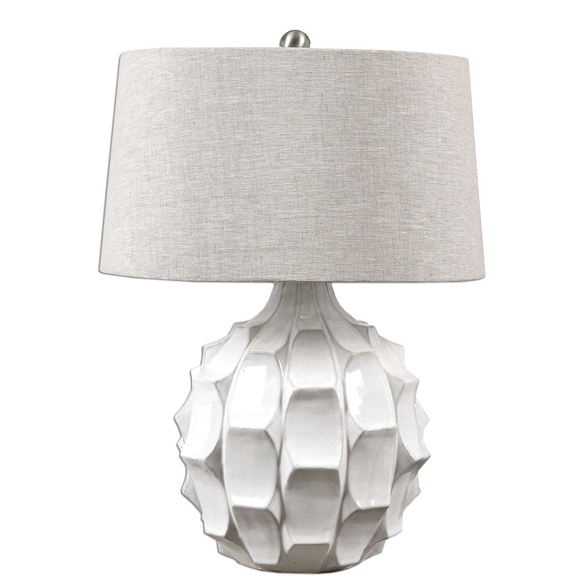 Scalloped Ceramic Base Finished In A Lightly Distressed Gloss White Accented With Plated Brushed Nickel Details. The Slightly Tapered Round Hardback Shade Is A Light Taupe-gray Linen Fabric With Natural Slubbing. Due To The Nature Of Fired Glazes On Ceramic Lamps, Finishes Will Vary Slightly.