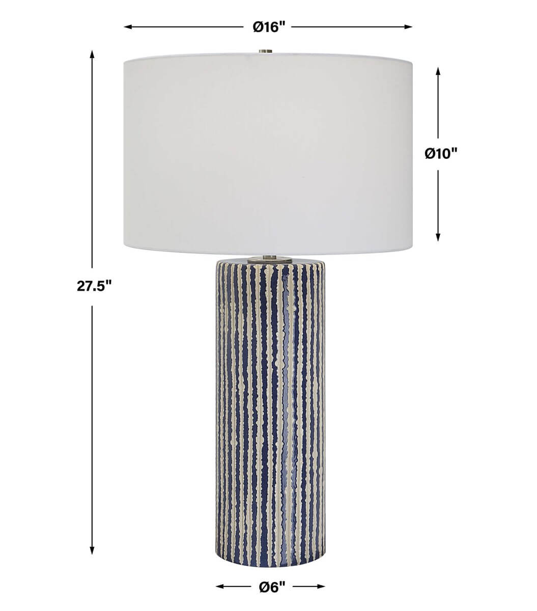 This ceramic table lamp features eye-catching, crudely carved, cobalt glazed stripes with contrasting ivory, accented with brushed nickel details. The round hardback shade is covered in a white fabric.