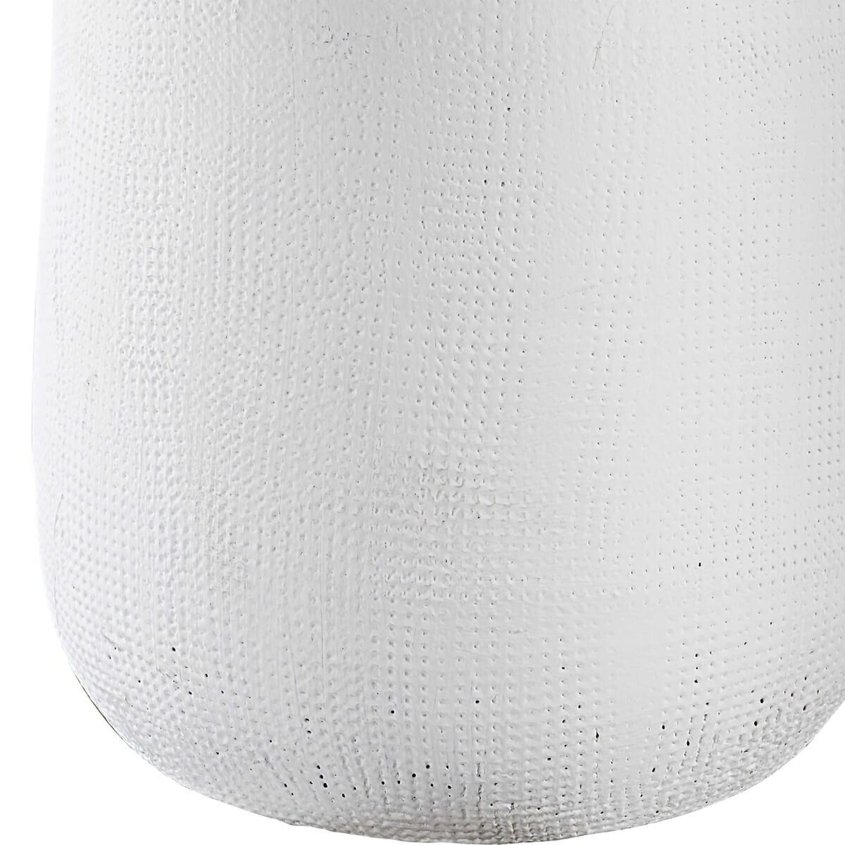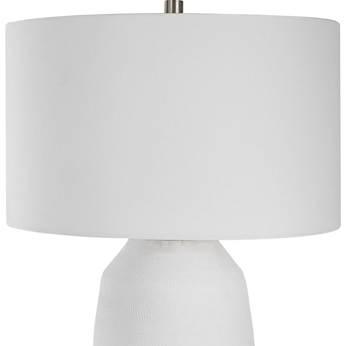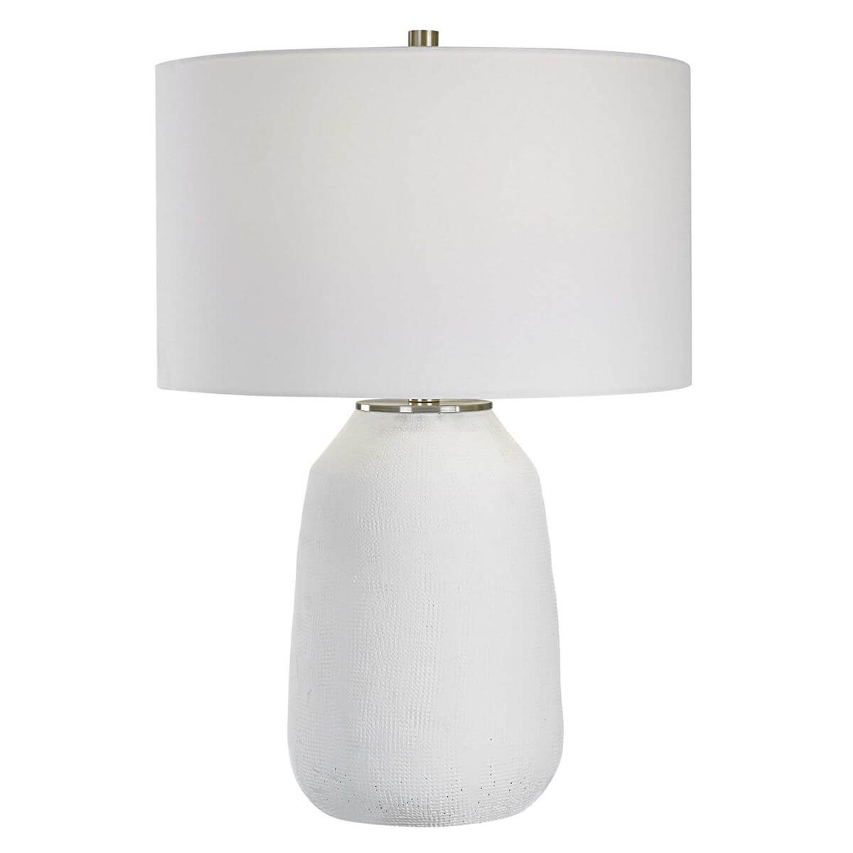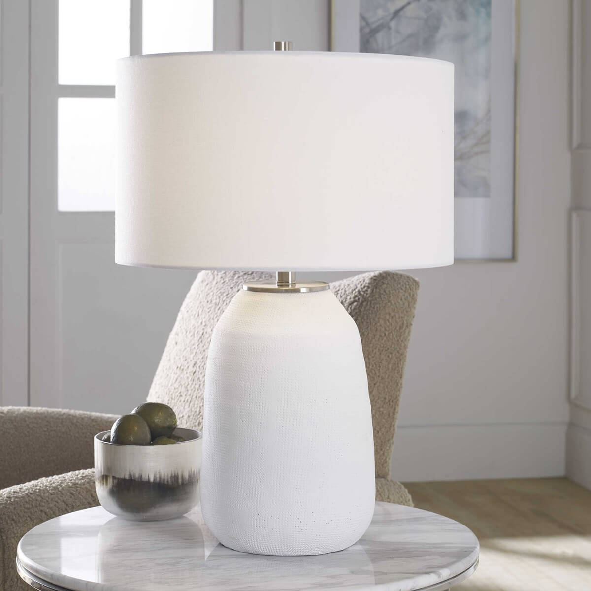 With its casual ceramic build and chalk white matte finish, the styling possibilities for this table lamp are virtually endless. All steel details are finished in brushed nickel. The lamp is paired with a hardback drum shade covered in a white fabric.