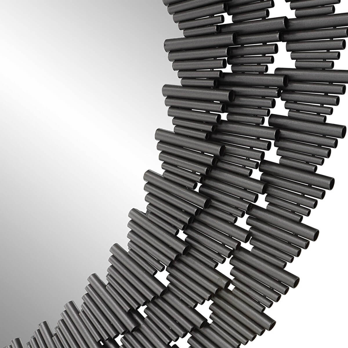 Round framed mirror features hand cut iron dowels in varying lengths arranged in three layers, finished in a burnished steel silver.