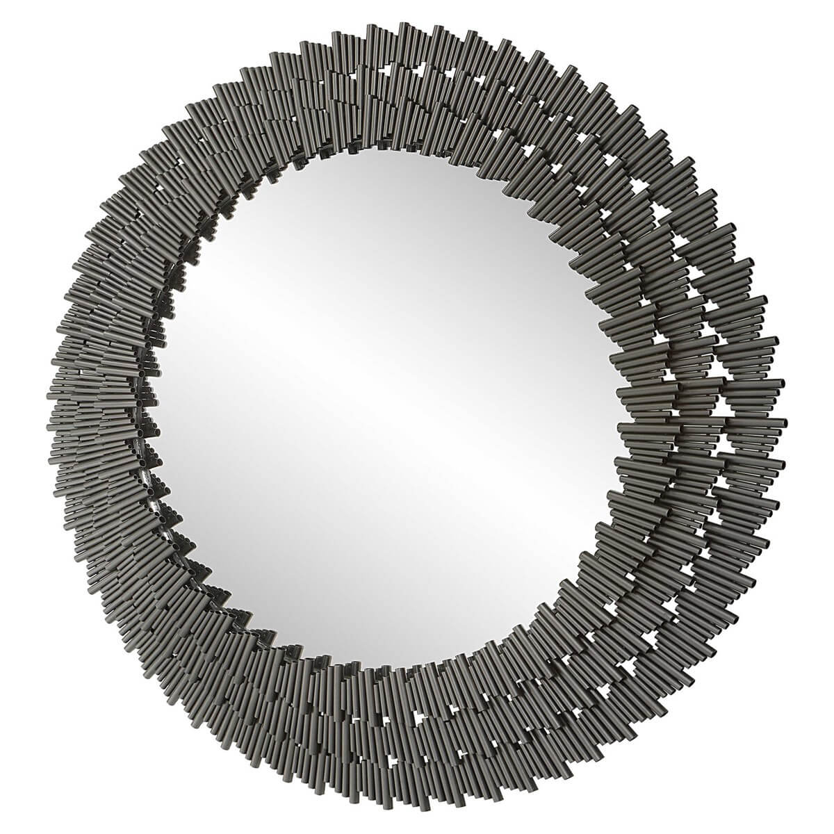 A contemporary work of art, this 3-dimensional round frame features hand cut iron dowels in varying lengths arranged in three layers, finished in a burnished steel silver. The mirror is surrounded by a generous 1 1/4" bevel.