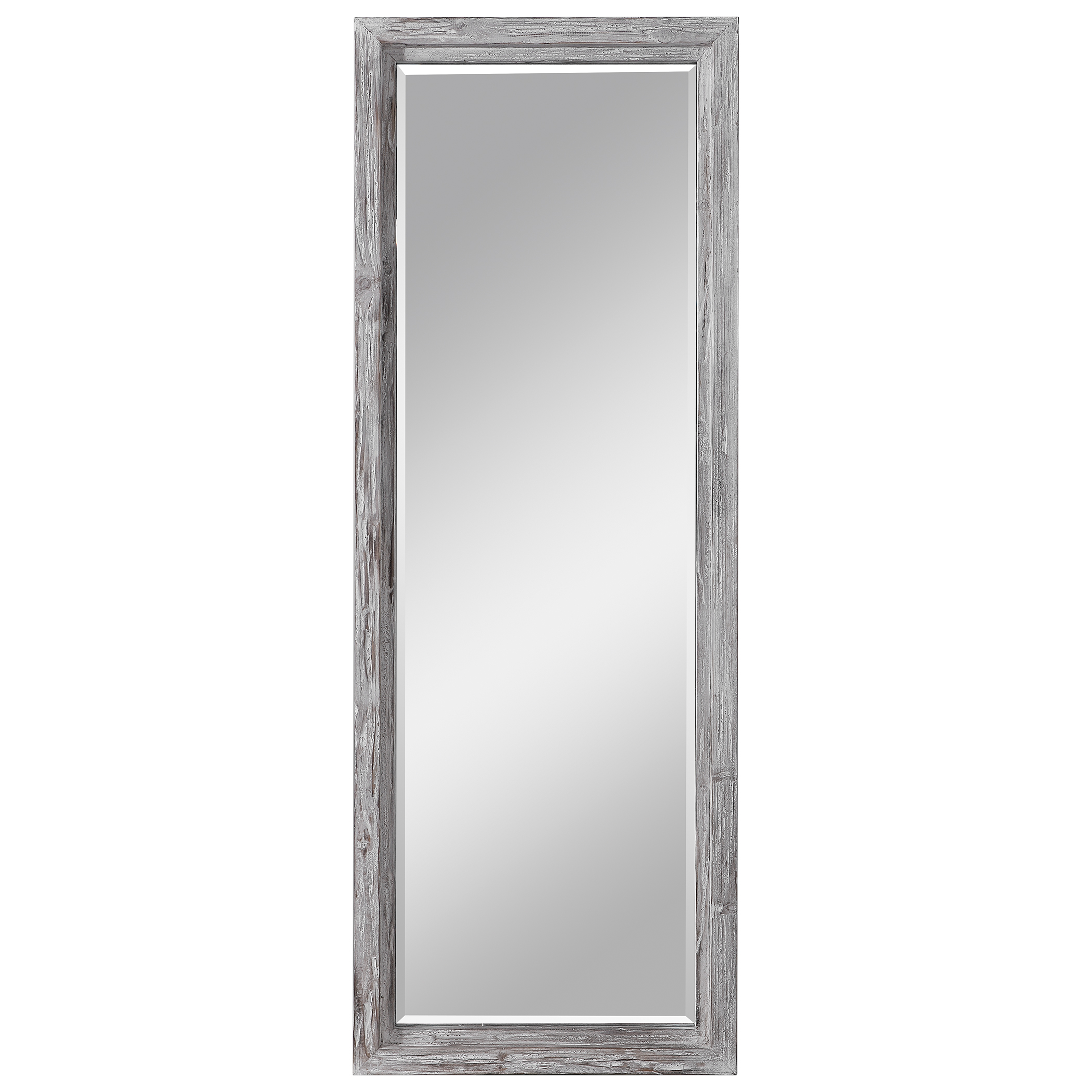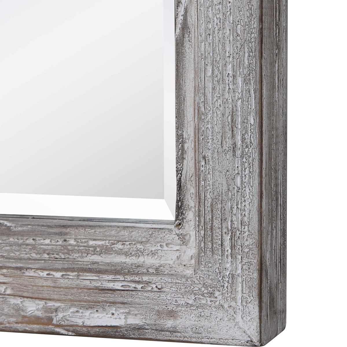 This Fir Wood Mirror Is Finished In An Aged White And Light Gray Wash With Visible Wood Grain And Distressing, Echoing A Rustic Farmhouse Style. The Piece Has A Generous 1 1/4" Bevel And May Be Hung Horizontal Or Vertical.