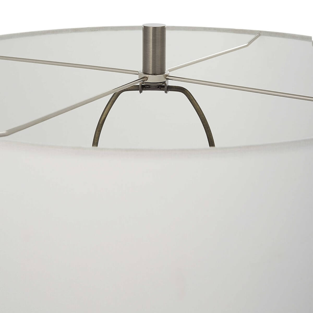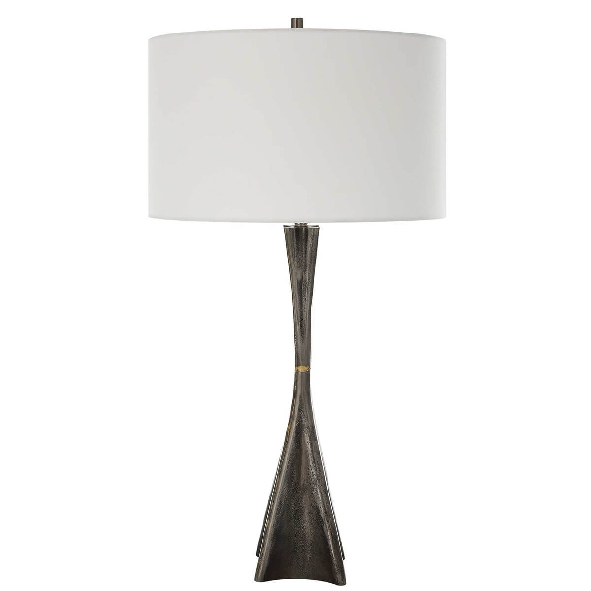 This cast iron lamp embodies both masculine industrial style with a subtle pitted texture accented with uneven traces of brass soldering that enhance the hand crafted construction, and a feminine quality with bold curves and delicate details. The round drum shade is wrapped in a white linen fabric.
