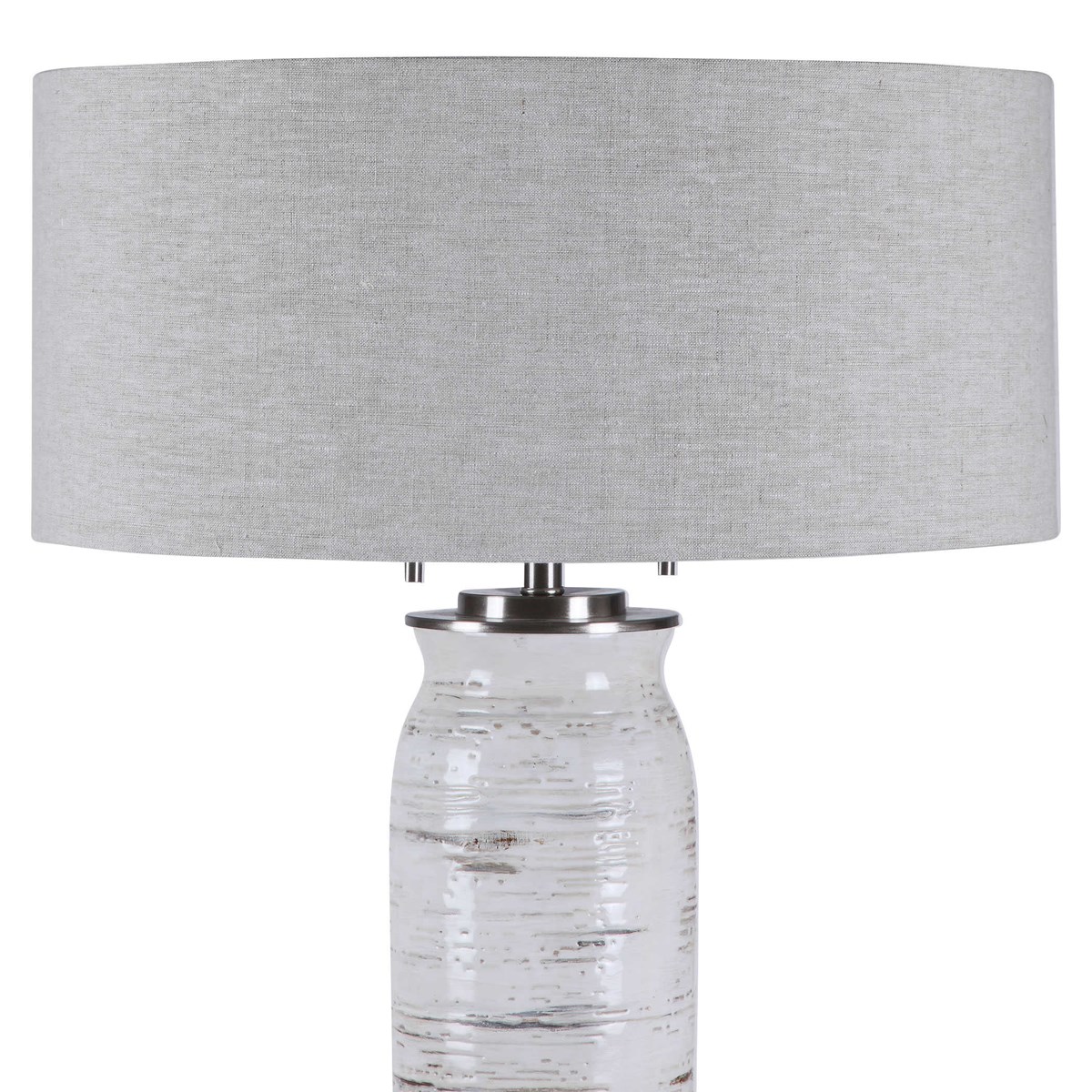 Inspired By The Bark Of A Birch Tree, This Table Lamp Features A Ceramic Base Finished In Off-white With Rust-colored Accents And Noticeable Texture And Distressing. The Piece Also Has A Crystal Foot And Brushed Nickel Details. The Round Hardback Shade Is A Light Oatmeal Linen Fabric With Slubbing.