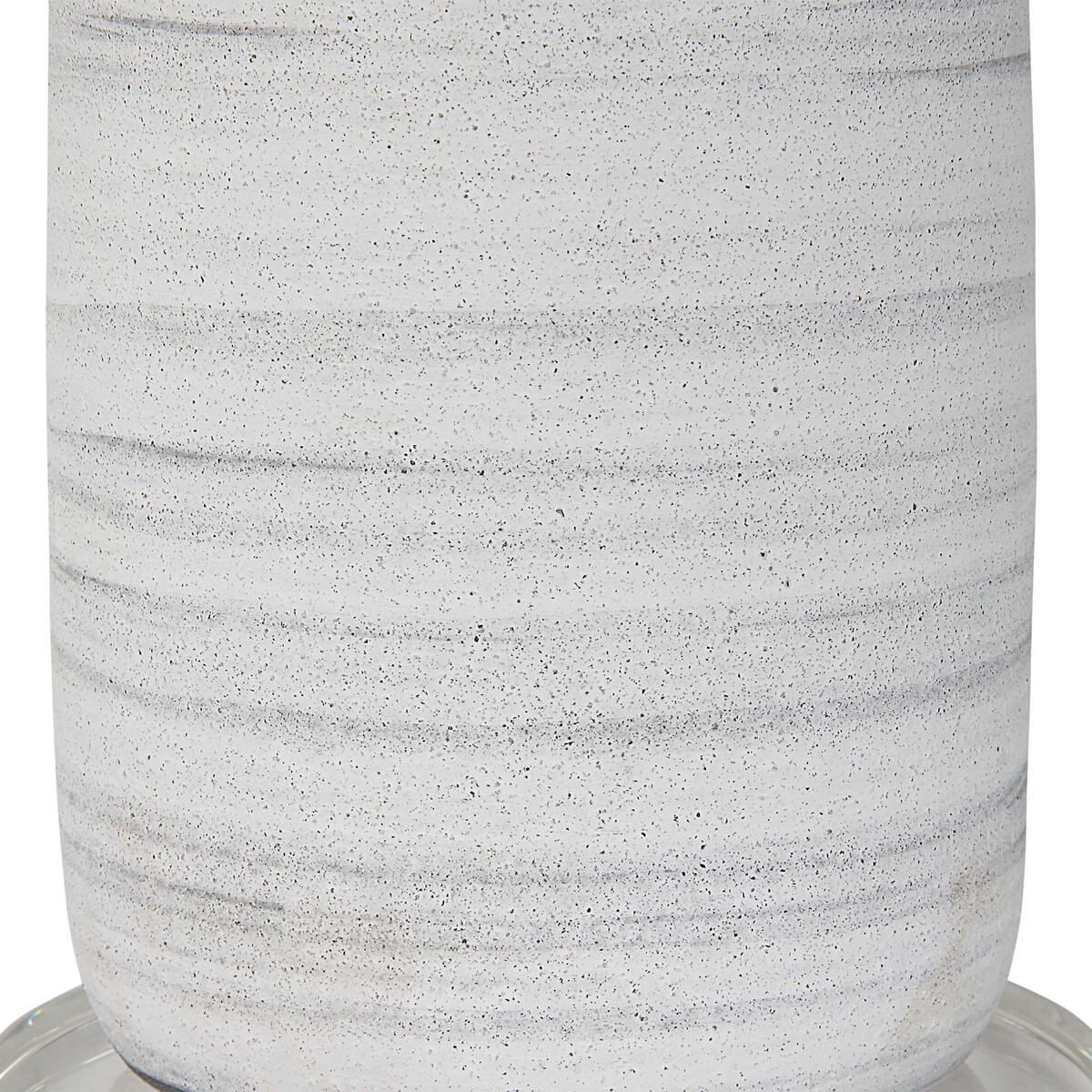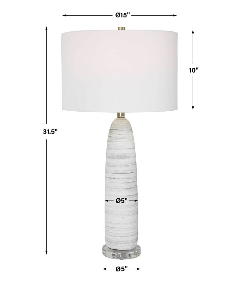 This sleek ceramic table lamp features a matte white glaze with brushed light gray detailing, paired with brushed nickel plated accents and a crystal foot. A white fabric drum shade compliments the piece.