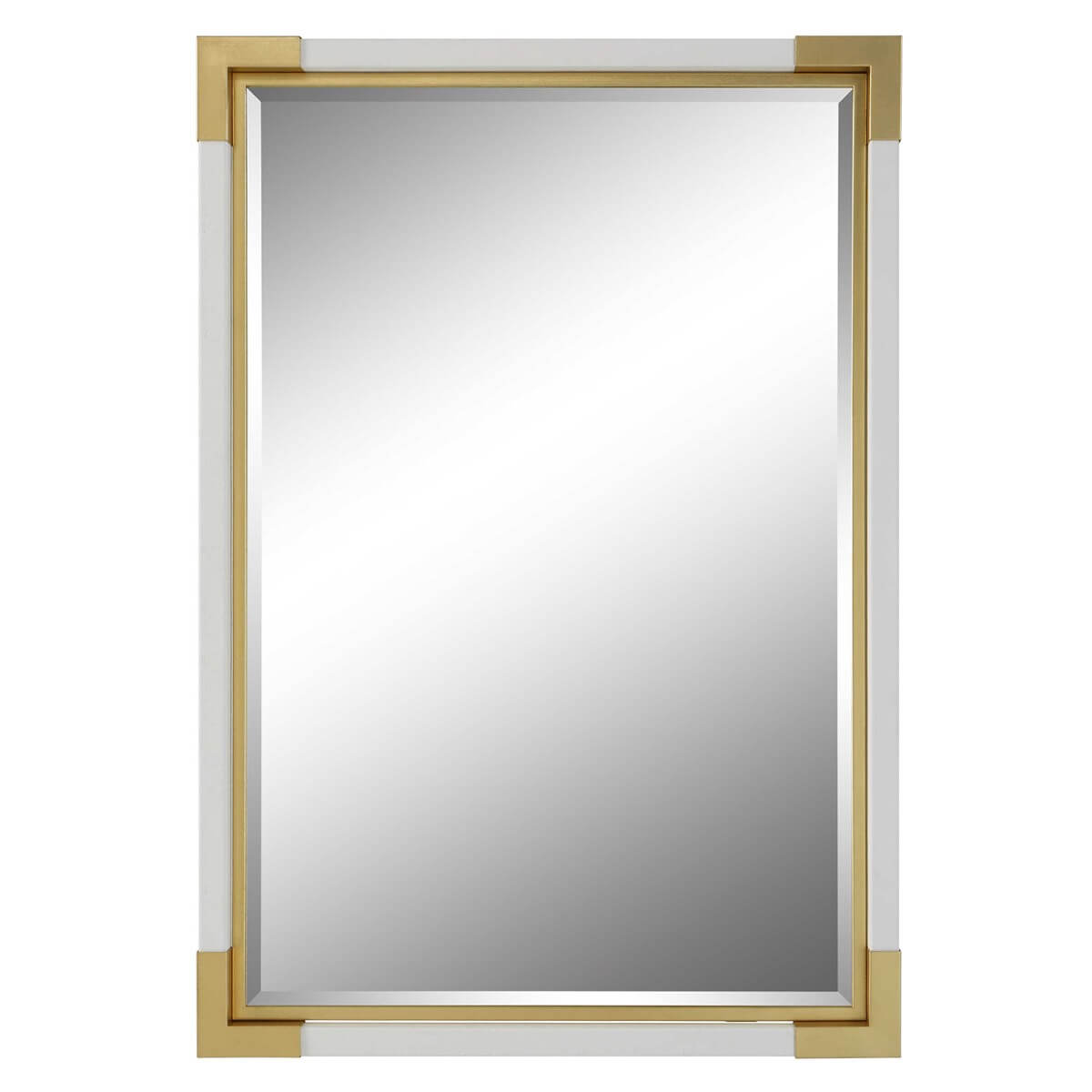 Showcasing an elevated traditional look, this mirror features a white faux shagreen wrapped frame with coordinating gold leaf corner caps and an iron inner liner. Mirror has a generous 1 1/4" bevel. May be hung horizontal or vertical.