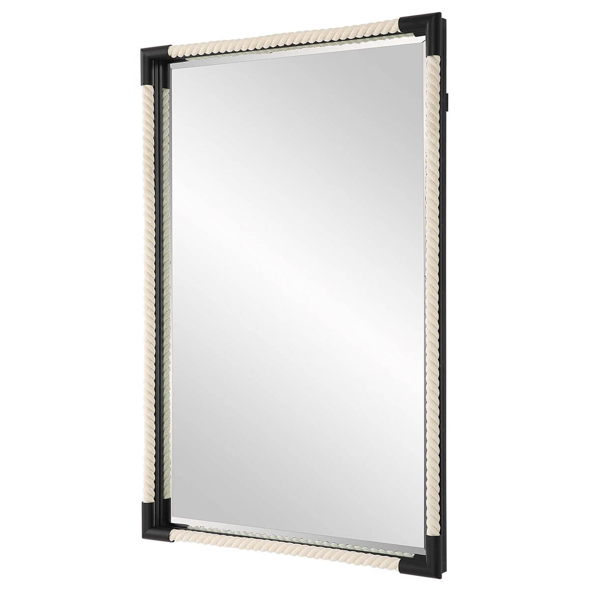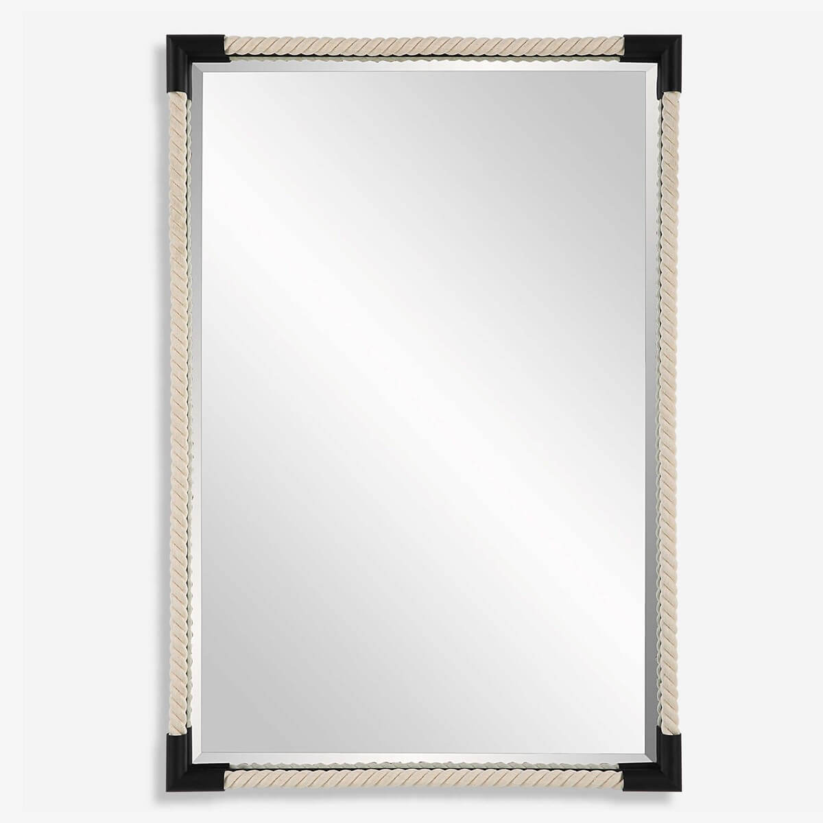 This versatile mirror features a thick, twisted, white cotton rope paired with matte black iron details for a modern coastal aesthetic. Mirror has a generous 1 1/4" bevel. May be hung horizontal or vertical.