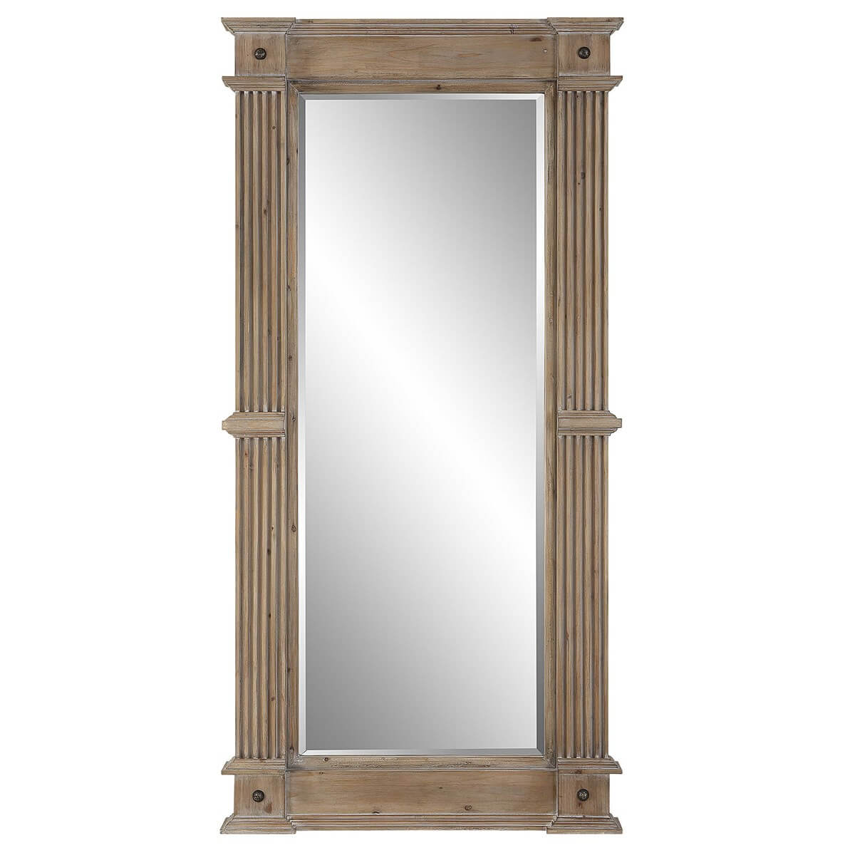 Influenced by traditional millwork, this oversized mirror showcases beautiful carved details in a naturally finished fir wood with wood grain and knotting. Mirror has a 1 1/4" bevel.