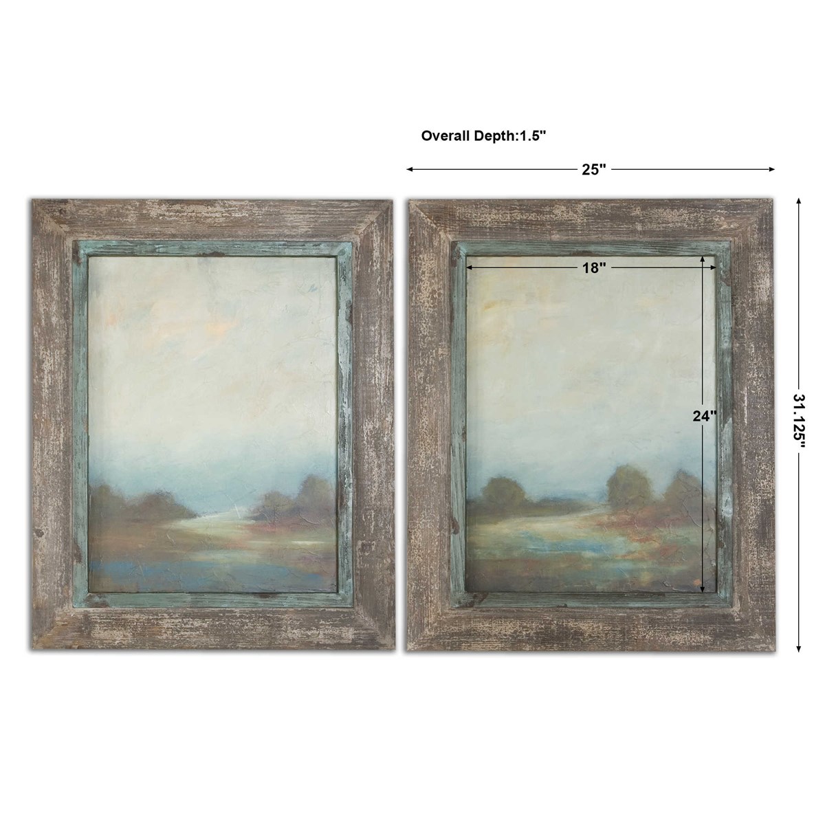 This Pair Of Oil Reproductions Adds Rustic Style To A Design. Each Landscape Features Moody Shades In A Hand Applied Brushstroke Finish. A Heavily Textured, Salvaged Wood Frame With A Medium Wood Tone Base Has Off-white And Taupe Distressing And A Gray Glaze. The Inner Lip Is Heavily Distressed With Medium Brown Undertones, Muted Aqua Accents, And A Heavy Gray Wash. Artwork By Lisa Ridgers.