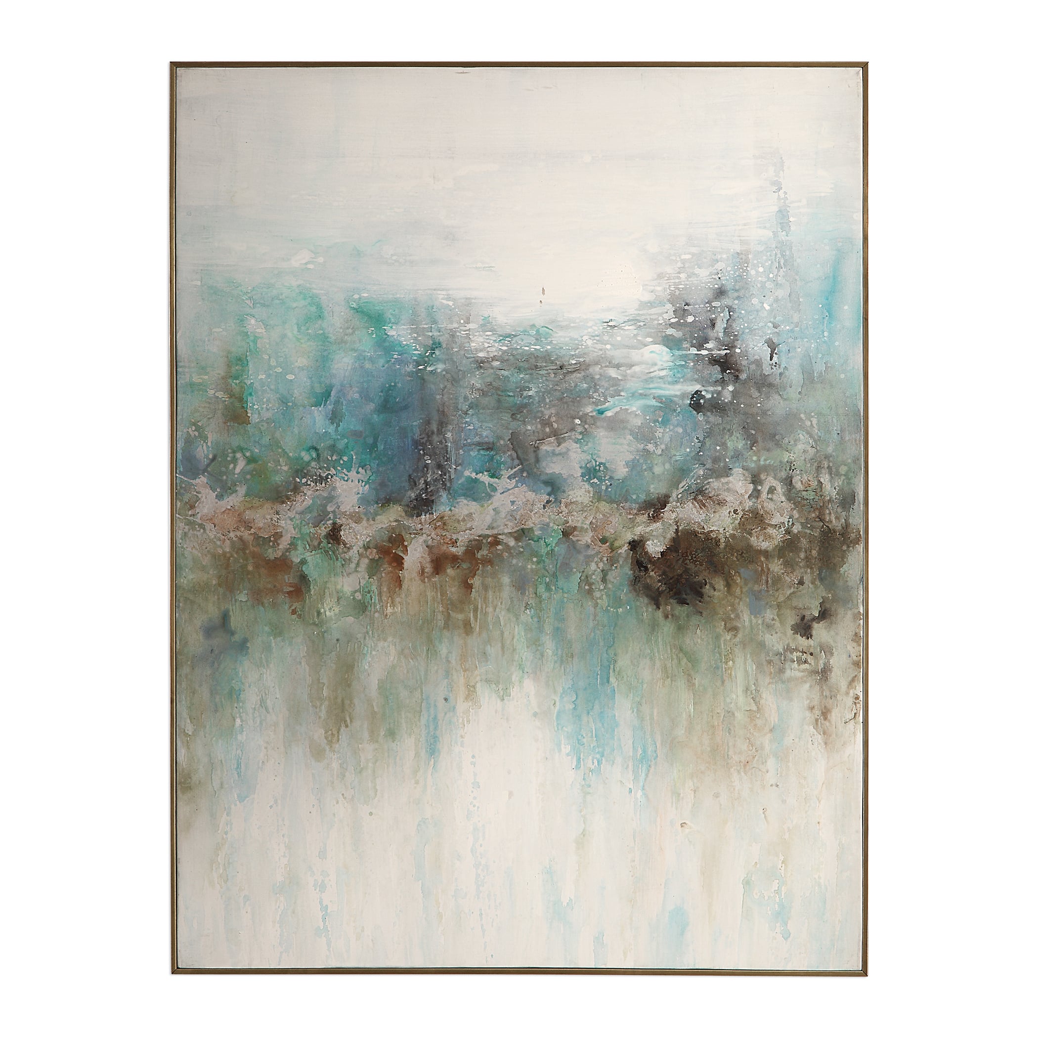 This Modern, Abstract Artwork Is Hand Painted On Canvas In On Trend Shades. Vibrant Navy, Cobalt, Teal, And Purple Hues Are Heavily Centered In The Piece With A Textured Finish. On Each Side, Lavender, Sea Foam, And Aqua Hues Are Accented By Gold And Brown Details. A Gold Gallery Frame With A Black Outer Edge Surrounds The Artwork. Due To The Handcrafted Nature Of This Artwork, Each Piece May Have Subtle Differences.