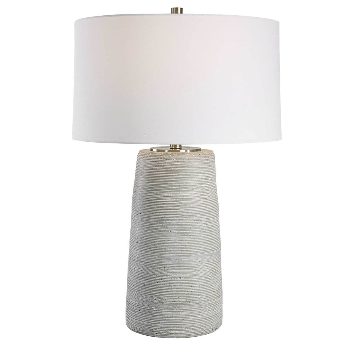 Handcrafted in an artisanal style, this table lamp is formed from ceramic in neutral off-white and gray tones with carved ring detailing. Steel accents are finished in a complementary brushed nickel. The hardback drum shade is covered in a white linen fabric.