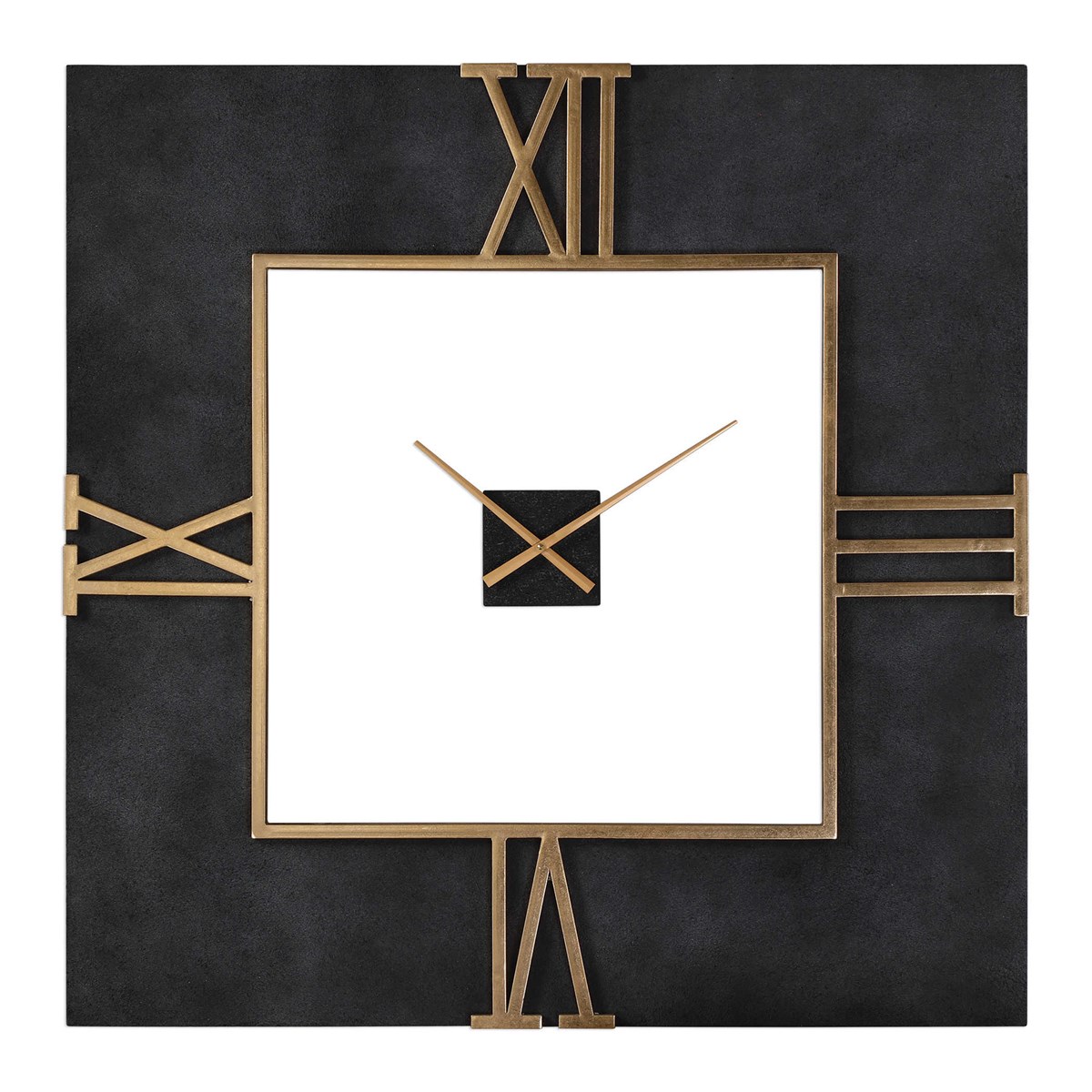 Wall clock featuring textured black concrete with lightly antiqued gold leaf accents. Quartz movement ensures accurate timekeeping. Requires one "AA" battery.