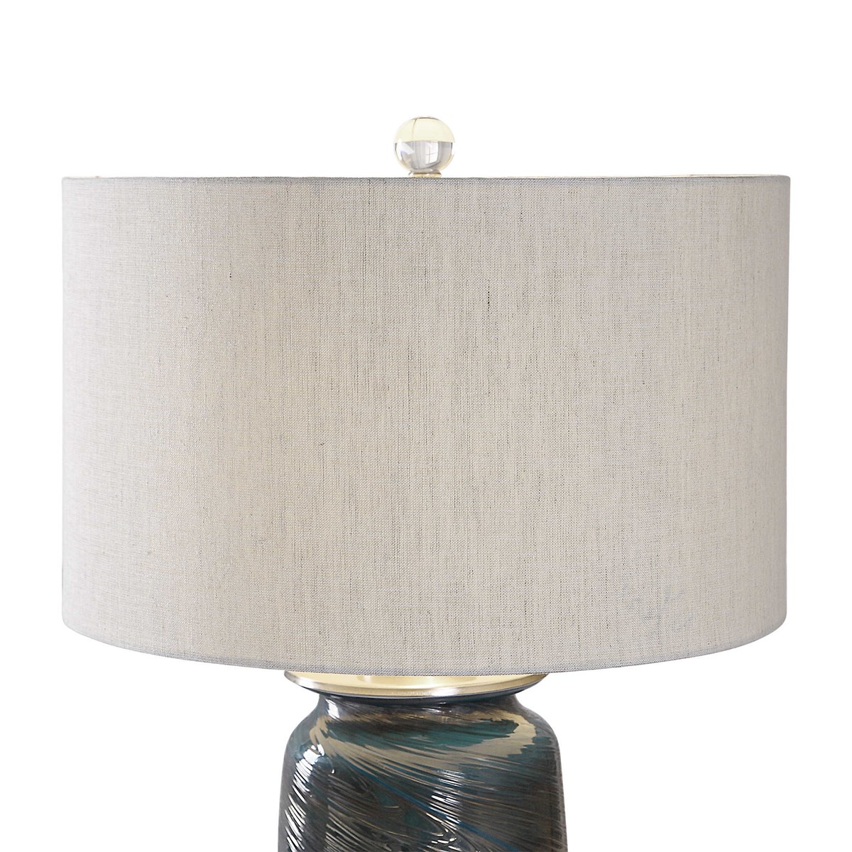 This Table Lamp Features A Decorative Glass Base That Showcases A Unique Swirl Texture, Highlighting Shades Of Ocean Blues, Greens And Metallic Bronze. Accenting These Vibrant Colors Are Brushed Nickel Plated Details And A Thick Crystal Foot. The Round Hardback Drum Shade Is A Light Beige Linen Fabric With Natural Slubbing.