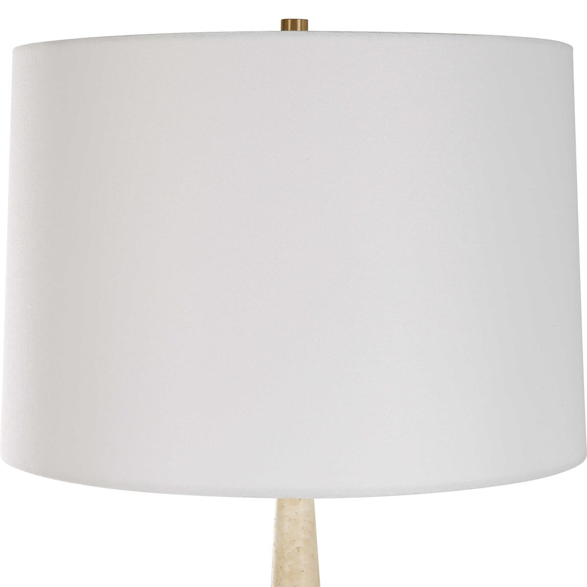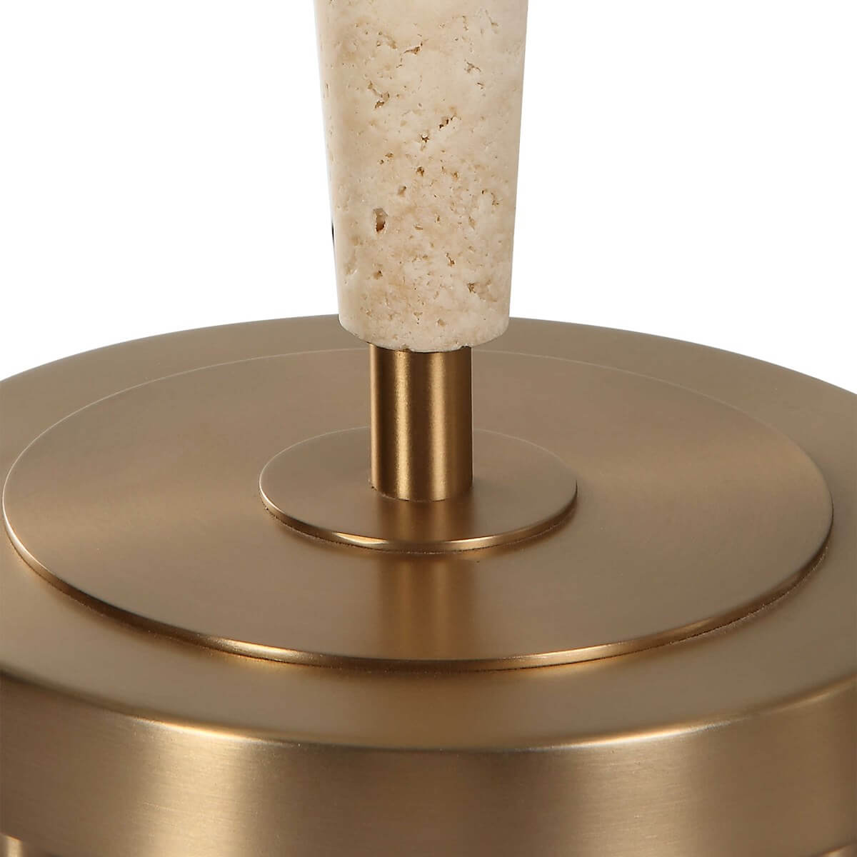This table lamp combines modern silhouette with organic textures and materials featuring two cone shaped pieces of light beige travertine separated by iron details finished in plated brushed brass. The slightly tapered round hardback shade is covered in white linen fabric.