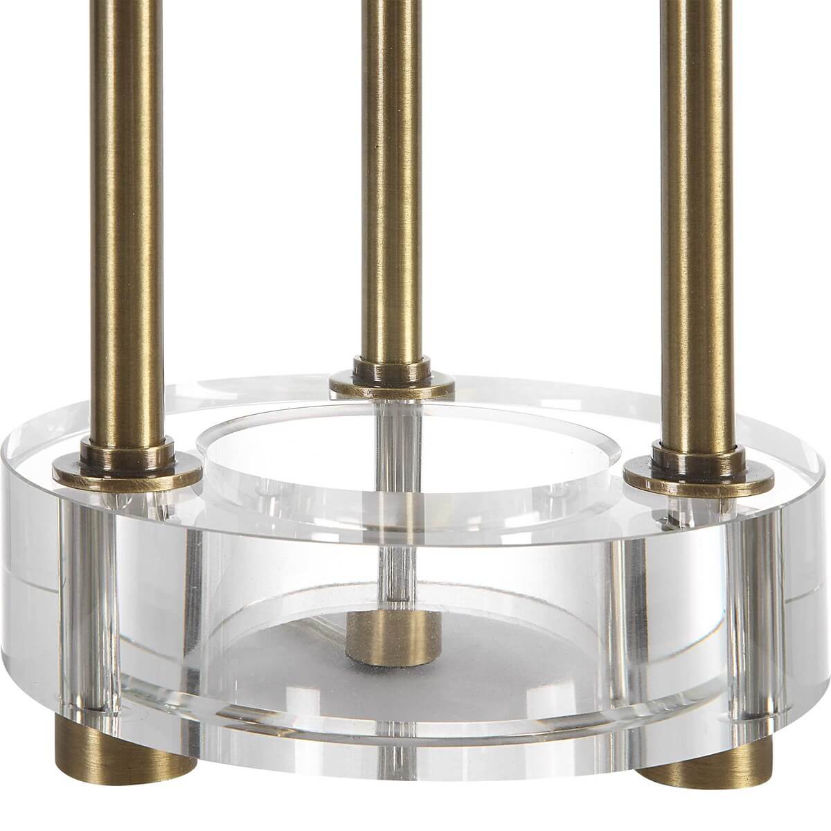 Sophisticated and timeless, this table lamp showcases an updated traditional feel with solid iron rods finished in plated antique brass and an elegant crystal foot.