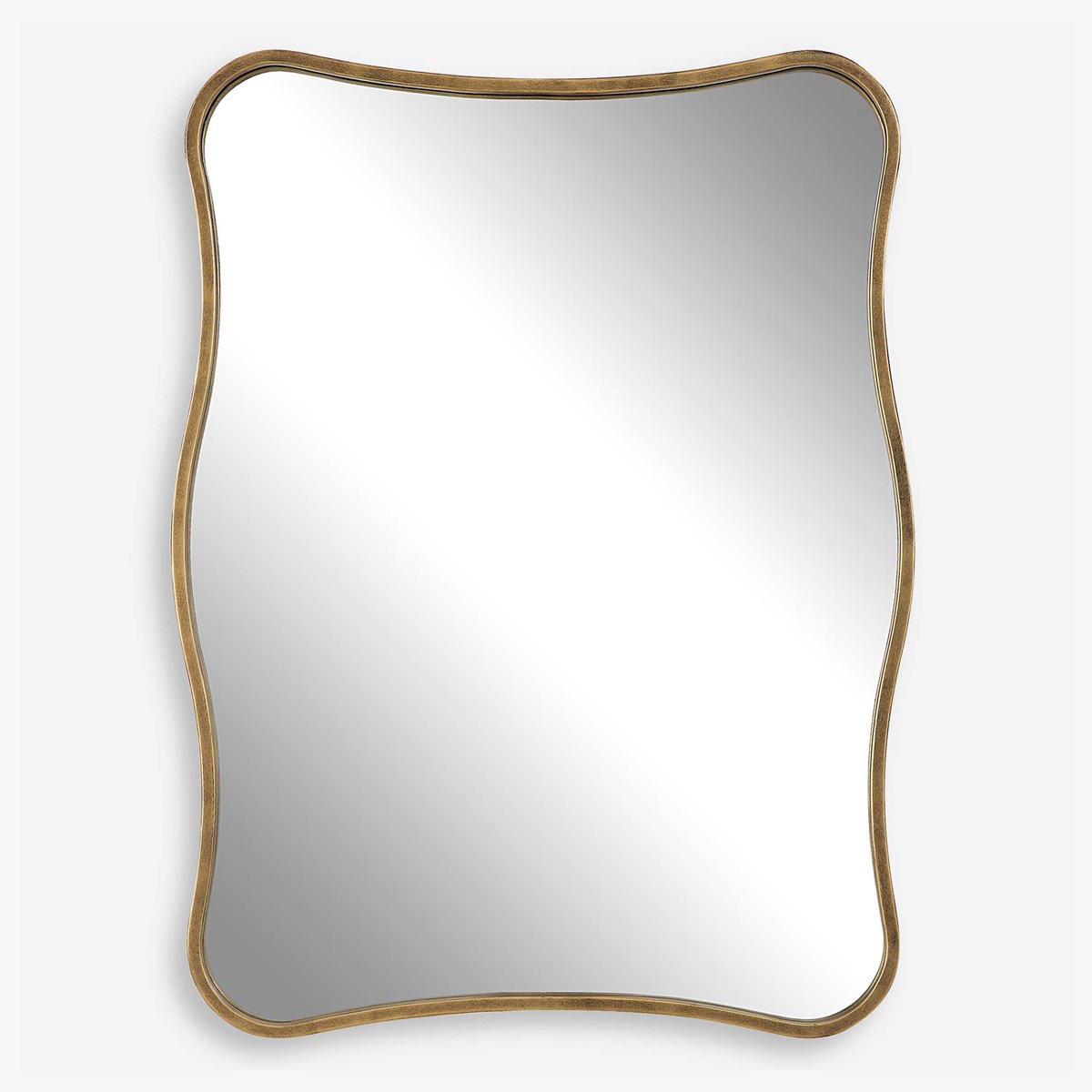 This curvy vanity mirror features a shaped iron frame finished in a heavily antiqued gold. May be hung horizontal or vertical.