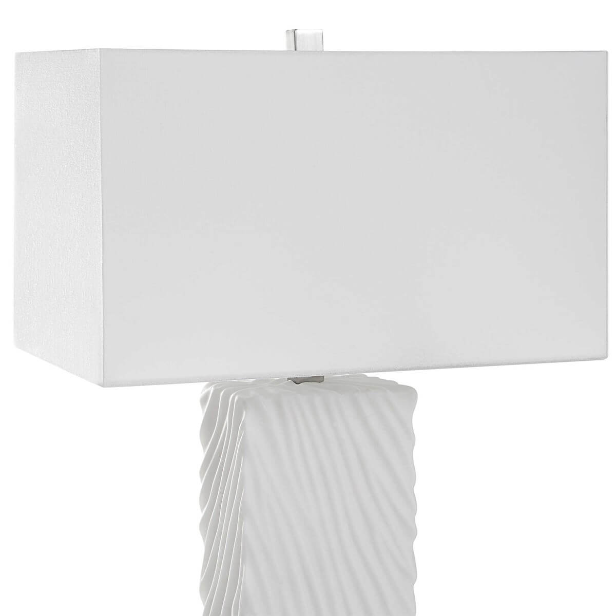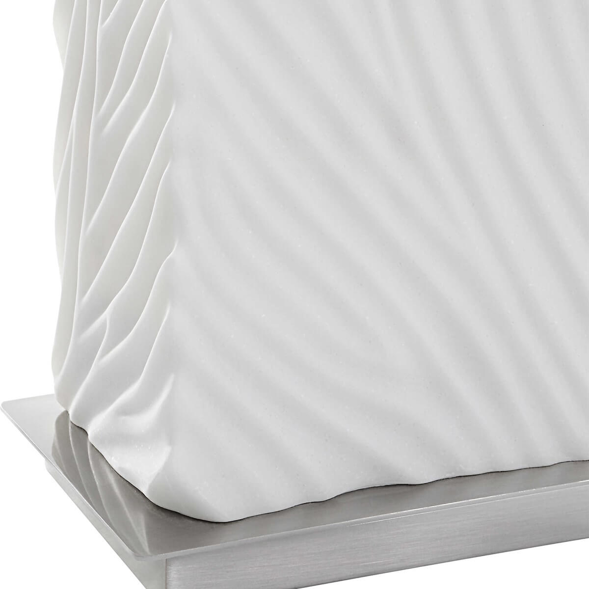 Stylish and sophisticated, this table lamp is executed in a rich carved material made of granulated white marble that accurately replicates the look of Thassos marble and is accented by brushed nickel finished iron details. A rectangle hardback shade in white linen complements the design.